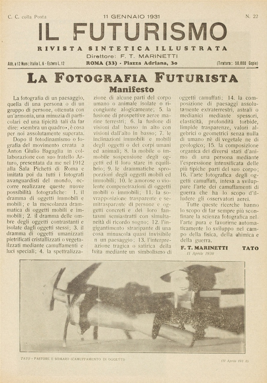 Marinetti’s manifesto also inspired a group of young visual artists, largely based in the modern capital of Milan, leading to further declarations that articulated the technical aspects of futurism’s wide-ranging opera d’arte totale: Giacomo Balla’s manifesto of futurist painting (1910), Umberto Boccioni’s manifesto of futurist sculpture (1913) 3, Antonio Sant’Elia’s manifesto of futurist architecture (1914) 4, and Guglielmo Sansoni’s manifesto of futurist photography (1930) 5.