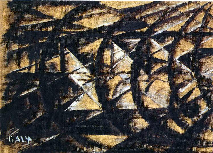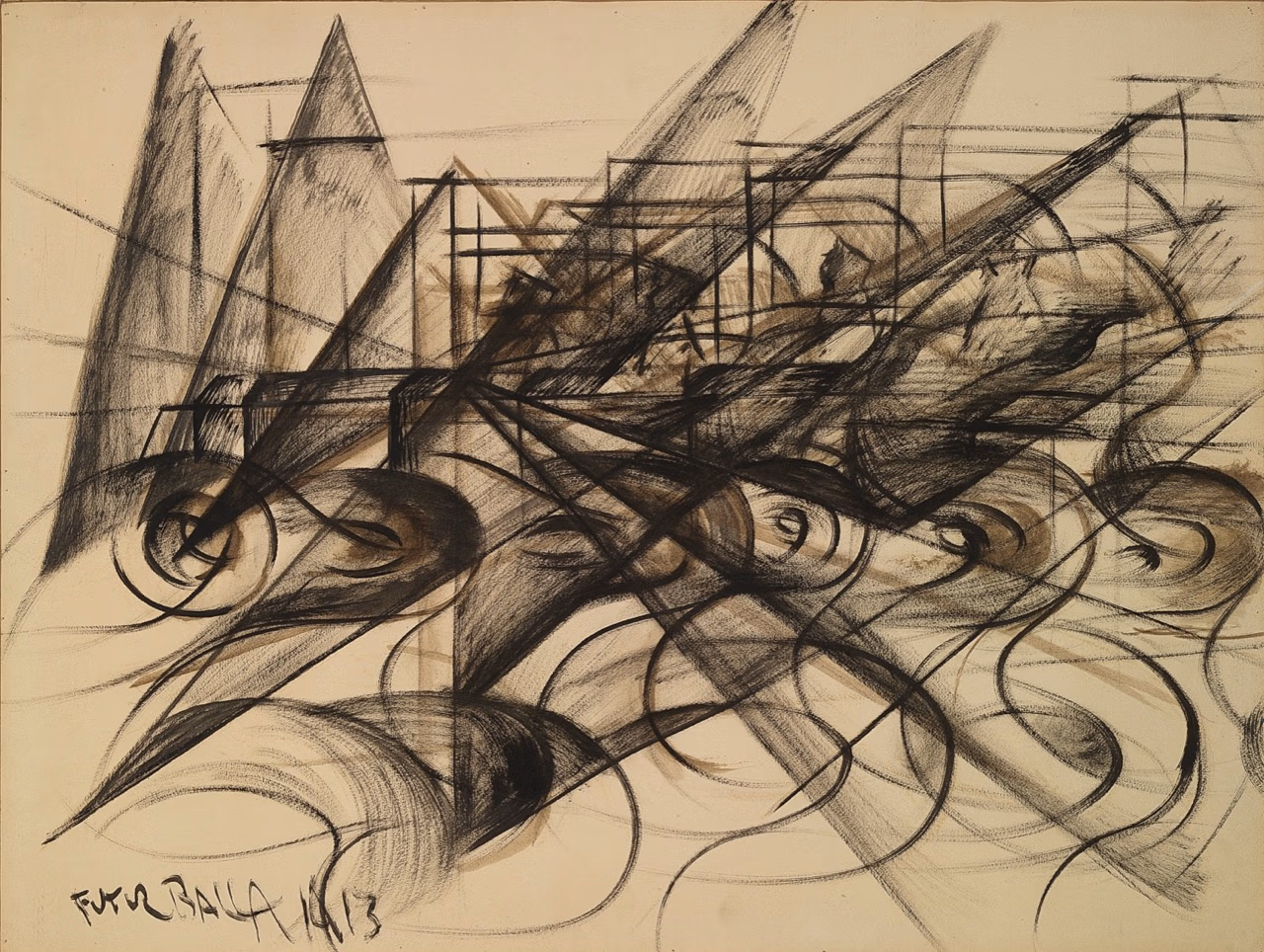 By late 1912 and early 1913, futurists increasingly turned toward mechanised subjects—automobiles, motorcycles, racing cyclists, trains, and urban crowds. In 1913, Balla produced Auto in corsa (studio) (Speeding Automobile (study), 1913) 12 and Velocità di motocicletta (studio) (Speed of a Motorcycle (study), 1913) 13, visualising Marinetti’s proclamation: “The world’s splendour has been enriched by a new beauty: the beauty of speed… A roaring automobile… that seems to run on shrapnel, is more beautiful than [The Winged] Victory of Samothrace.” Two years later, in 1915, the year Italy joined World War I, Gino Severini produced Treno blindato in azione (Armoured Train in Action) 14, an oil painting of five faceless soldiers aiming their rifles out of a militarised locomotive. A war enthusiast, Severini’s composition combined Marinetti’s militant rhetoric with the mechanical pulse of the modern city.