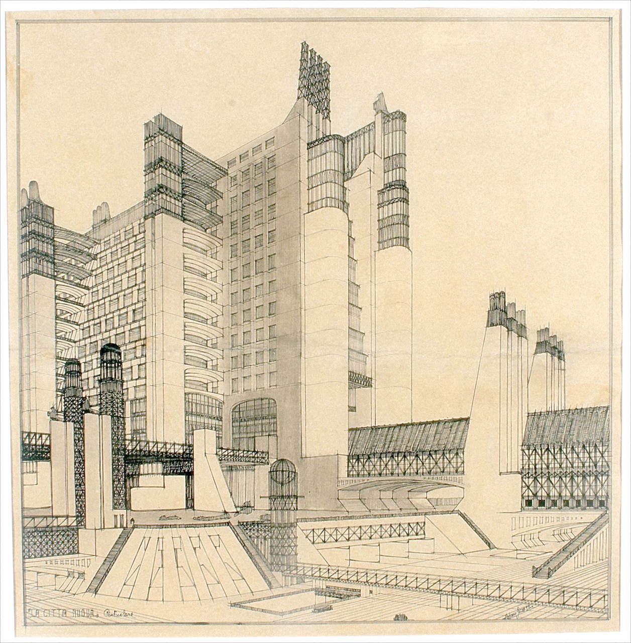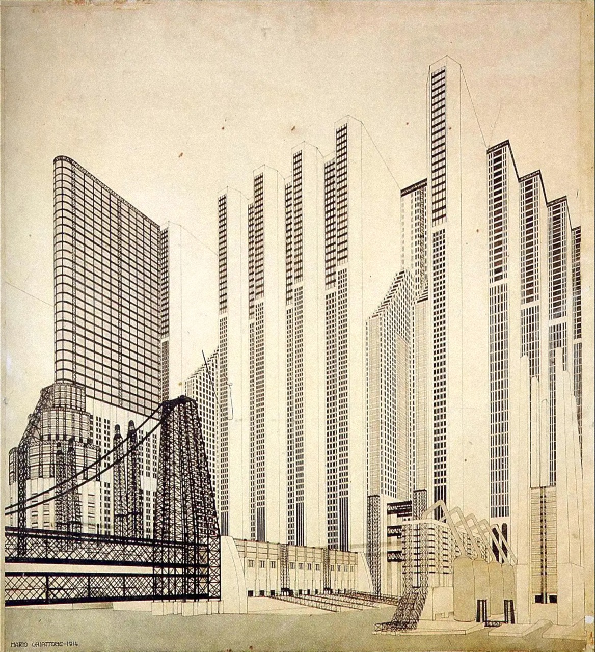 Around this time, architects also began to articulate their visions of the futurist city. Meeting at the Accademia di Brera in 1909, Sant’Elia and Mario Chiattone produced a series of visionary architectural drawings and watercolours, from Sant’Elia’s Città Nuova (New City, 1914) 15 to Chiattone’s Edifici per una metropoli moderna (Buildings for a Modern Metropolis, 1914), 16 which imagined monolithic skyscrapers, suspended walkways, and elevated highways. Their limited technical training, however, prevented the realisation of these utopian designs. A fervent nationalist, Sant’Elia died fighting Austro-Hungarian forces at the Eighth Battle of the Isonzo in 1916, leaving behind only a single completed villa outside Como. Chiattone, meanwhile, distanced himself from futurist propaganda and later advocated for a “positive and feasible” architecture. Though not realised in the way they once might have imagined, their visionary designs anticipated modern skyscrapers and profoundly influenced later urban imaginiaries— Sant’Elia’s drawings, in particular, inspired both the social housing projects of the 1960s and the cinematic worlds of Fritz Lang’s Metropolis (1927) 17 and Ridley Scott’s Blade Runner (1982) 18.