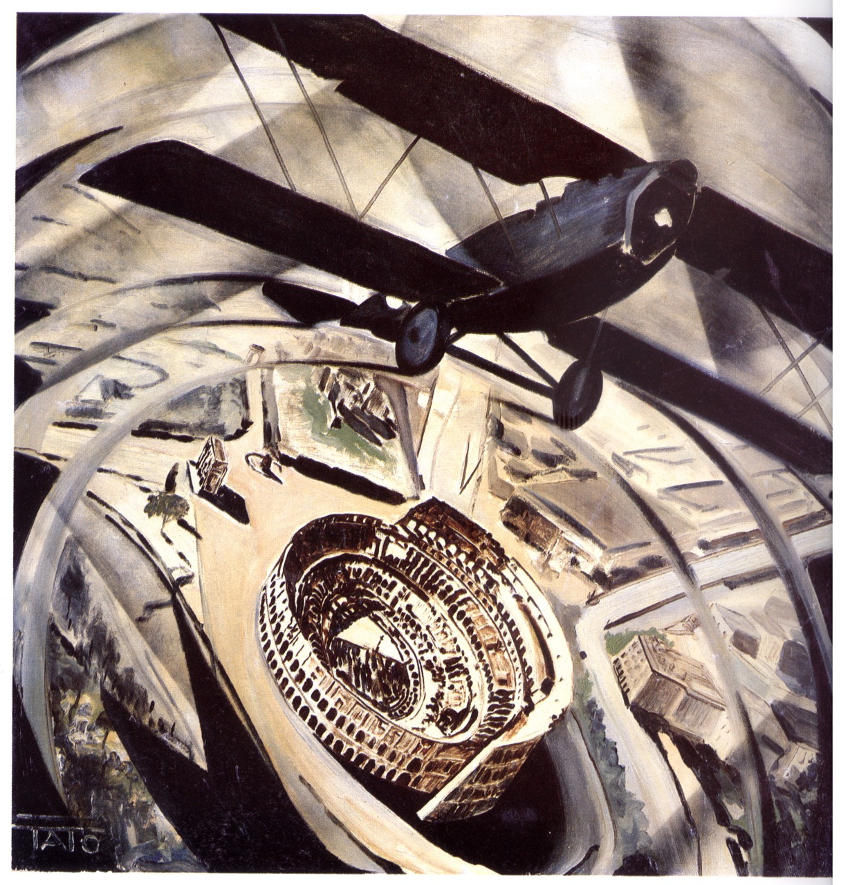 By the 1930s, futurists once again pivoted, turning their gaze skyward toward air travel and technological communication. Under the banner of Aeropittura (Aeropainting), artists such as Sansoni (known as Tato) and Tullio Crali produced works that celebrated the nationalist and technological significance of aviation. Sansoni’s Sorvolando in spirale il Colosseo [Spiralata] (Flying Over the Coliseum in a Spiral [Spiraling], 1930) 23 captured the exhilaration, rapture, and vertigo of flight, while Crali’s Granvolta rovesciata [Giro della morte] (Upside-Down Loop [Death Loop], 1938) 24 and Prima che si apra il paracadute (Before the Parachute Opens, 1939) 25 dramatised aerial warfare as World War II approached.