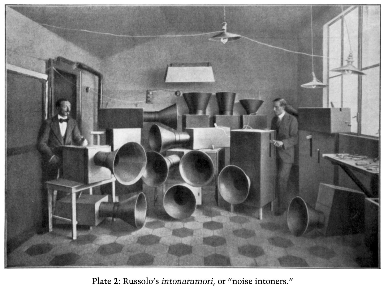 Among the movement’s most avant-garde interpretations were its early experiments in declamatory poetry, experimental music, and riotous performances. Intended to give rise to “body madness”, Marinetti’s own parole in libertà (words in freedom) poems, such as Bombardamento published in Zang Tumb Tumb: Adrianopoli ottobre 1912: Parole in libertà (Zang Tumb Tumb: Adrianople October 1912: Words in freedom, 1914) 1, destroyed natural syntax—abolishing adjectives and adverbs, using verbs in the infinitive, and suppressing punctuation. These linguistic experiments directly inspired painter and composer Luigi Russolo’s cacophonous, dissonant, and polyphonic “noise music”, generated by his Intonarumori (noise intoners) 2 and performed for the first time at Gran concerto futurista per Intonarumori (Great Futurist Concert for the Intonarumori, 1914).