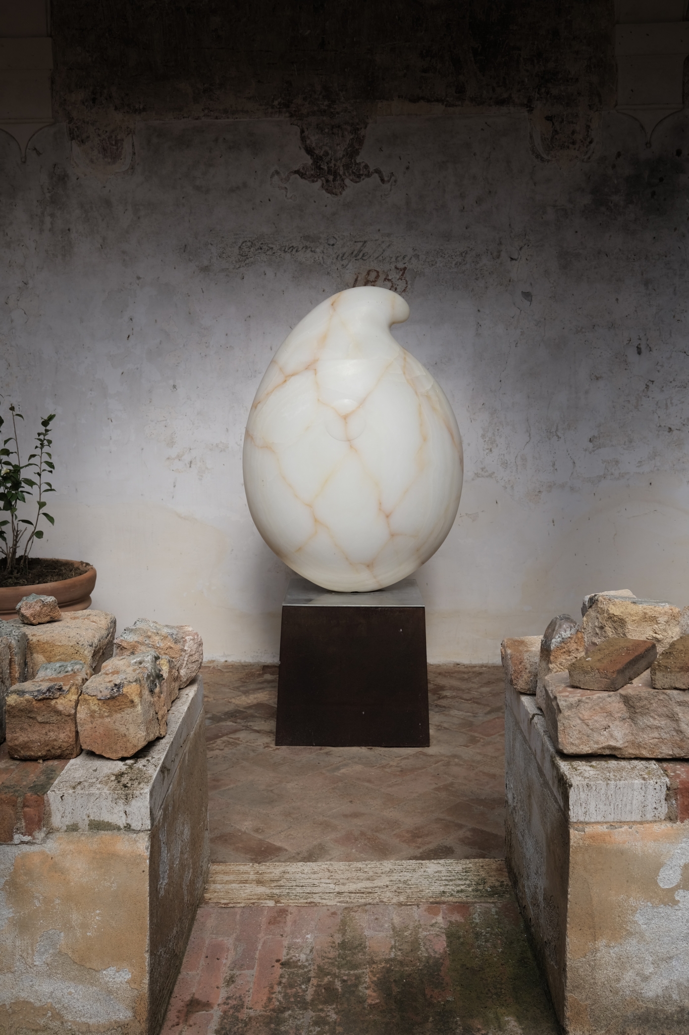 Since she bought it in 2011, Young has turned Santa Croce into an artistic paradise, and a fitting mise-en-scène for her sculptures. Near what was the altar, behind a long, rustic wooden table, sits one of her sculptures, a large disc in golden onyx. As well as heads and torsos, discs are one of the three “fundamental” forms that Young’s sculptures take. “I’ve always loved the perfect circularity of the moon and the sun, and I’m very aware that they are the origins of all life on earth, of us being here now,” says Young, as I spot an actual crescent moon still visible in the 10am sky. Young’s discs are symbolic representations of planetary beings. “It’s to do with honouring the moon as a great creative force in our part of the solar system,” says Young, pointing out the translucent quality of the sculpture’s sedimentary onyx, which allows light to shine through. “I like these poetic resonances. The birds sit on it too, every now and then. They live here too.”