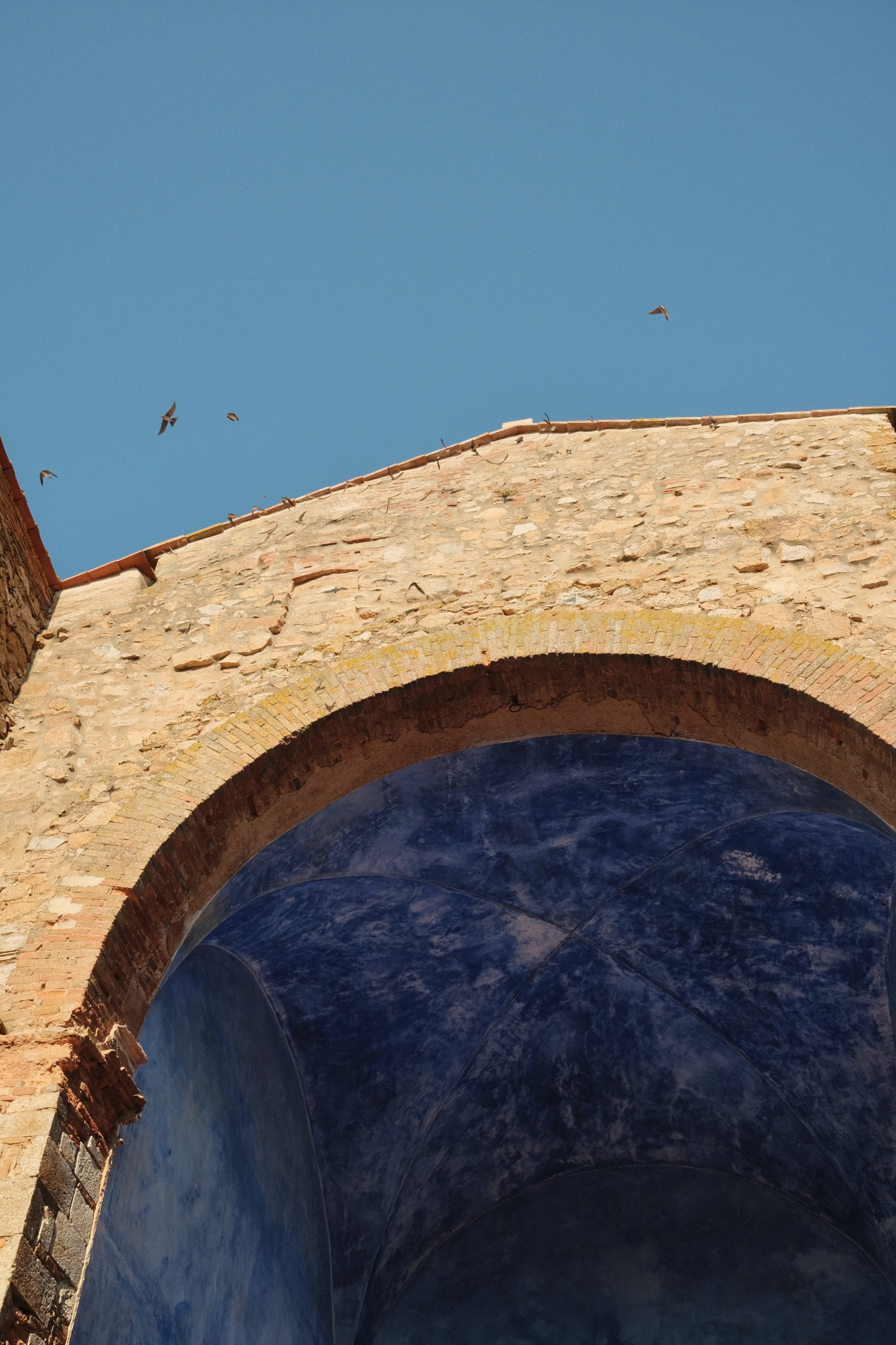 The former chapel of the Convento di Santa Croce, whose roof collapsed in 1928. The remainder of the ceiling has been painted lapis lazuli blue. Photography by Issy Carr.