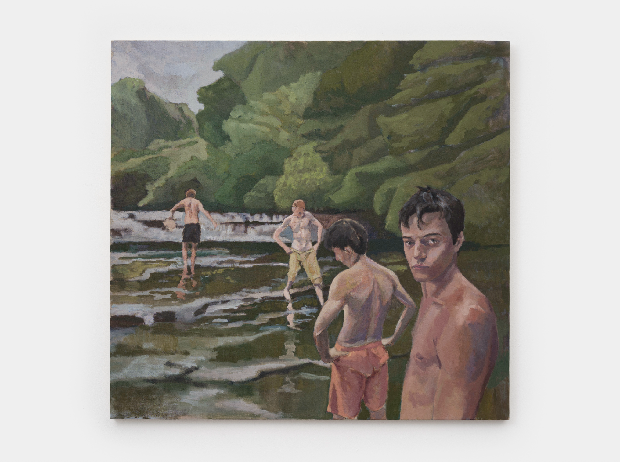 Echoing the contents of his prose, Sands’ paintings appear to ruminate on the physicality and psychological experience of embodied masculinity. As seen in works such as Lawn Party, The Invitation and The Last Holiday, he magnifies and accentuates the sinews and tonality of muscle, an attention to detail that reflects Sands’ own acute self-consciousness towards bodies in general. “My process draws from many things, but usually it’ll start with an observation, or something I’ve noticed in another person and which I’ll proceed to fixate on.” Sands explains. “I’ll notice the way someone holds their own body, their posture, or the way a hand falls on a hip. But it nearly always begins with an initial moment or movement—a charged bodily moment in a landscape.”