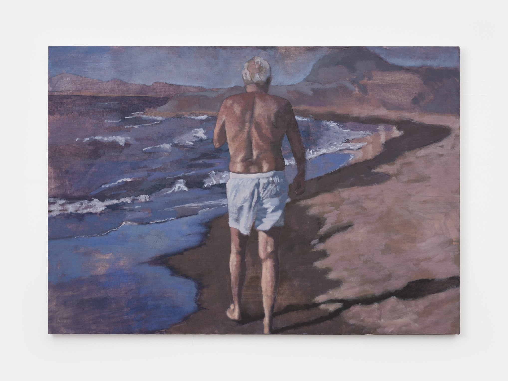 The weighted figures in his paintings take on a quasi-sculptural and statuesque quality. In this sense, his razor-sharp bodily observations reference a long-lasting academic interest in classical antiquity, a subject he studied at postgraduate level before returning to painting. “I understand renderings of the body in ancient art intimately well. I feel close to them, because I’ve studied them and lived with them.” He goes on to explain that the statues of classical antiquity resonated with him because of contrapposto,a pose in which a figure stands with most of its weight on one foot, causing the shoulders and arms to twist off-axis from the hips and legs. “I remember seeing ancient Greek statues as a teenager, and noticing that the contrapposto way of standing resembled how I feel most comfortable standing,” he explains. But unlike representations of the male physique in classical antiquity, Sands isn’t interested in creating perfected, beautified renderings of the body. “I want the bodies I paint to feel really fleshy and alive, rather than idealised . The bodies I paint are of real people doing real things.” The figures in the foreground of Sands’ paintings walk along shorelines, stand in shallow waters, or peer out into the distance. They are ordinary, and, for the most part, unaware they are the subject of voyeurism.