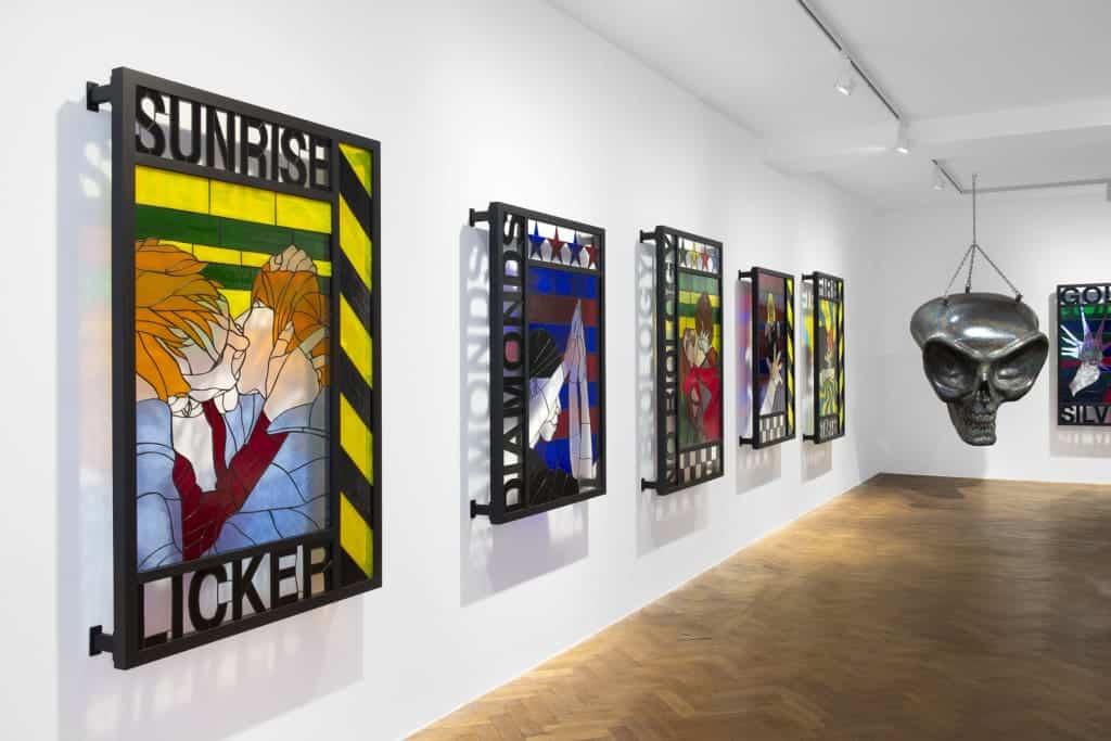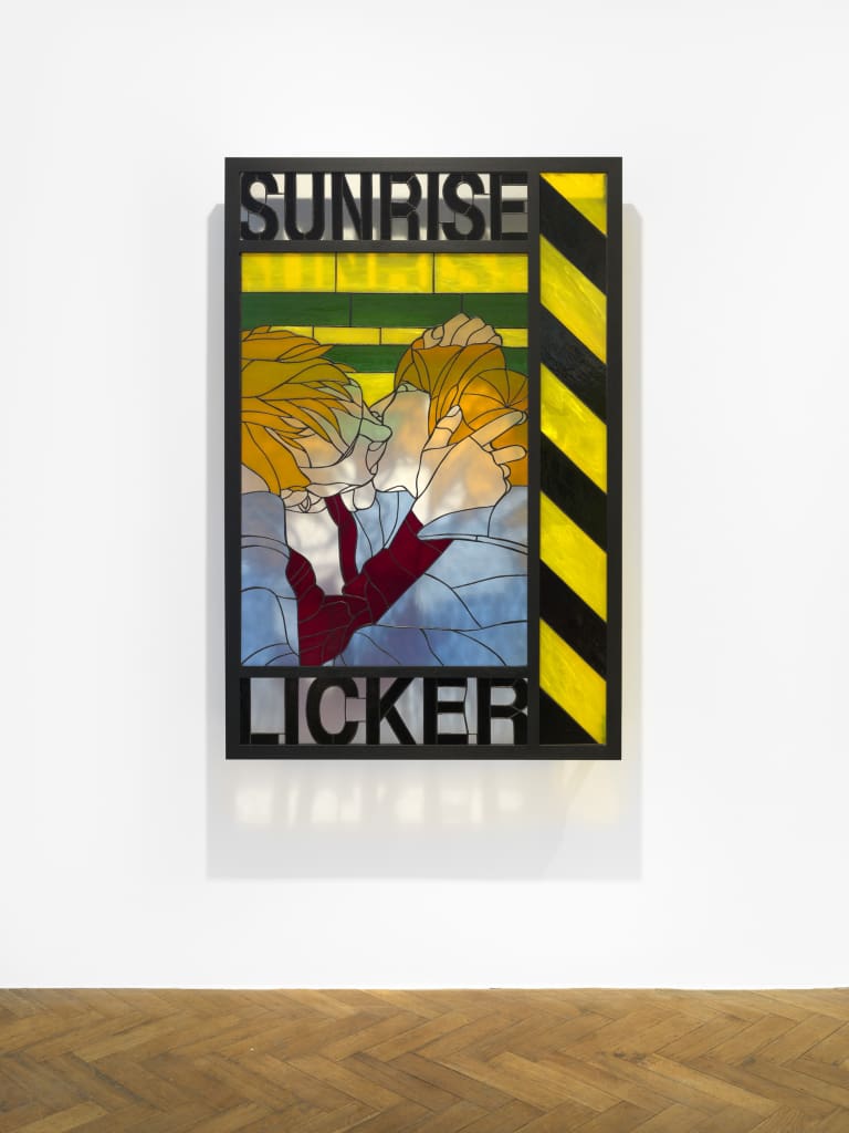EWK: The process of creating stained glass is an analog way of producing life through an image. With all the time our generation spends on screens, we think only about putting life through images that we want to exist. Stained glass is also a limiting medium, there is only a certain level of detail you can get into the image. Everything appears cartoonish, which resonates with a broader audience. In the beginning, I used more historical images, but now I use references of my own work, and re-appropriate photos of my performances in stained glass format. The graphics for these more recent works were inspired by the history of posters and flyers for demonstrations, parties, and propaganda. When I translate these graphic motifs taken from ephemeral posters into lasting stained glass, it transforms in the same uncanny way as does casting a plastic toy in bronze.