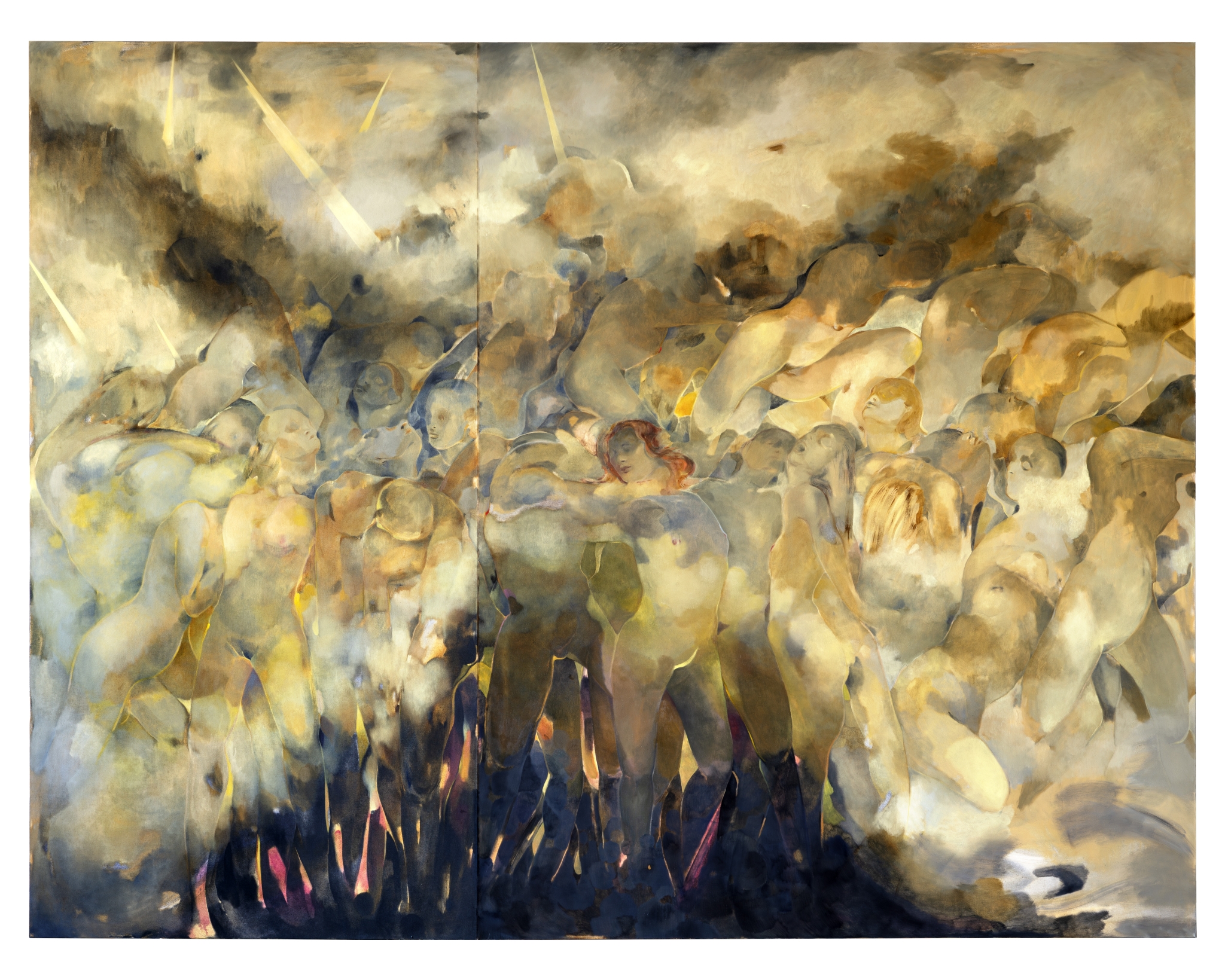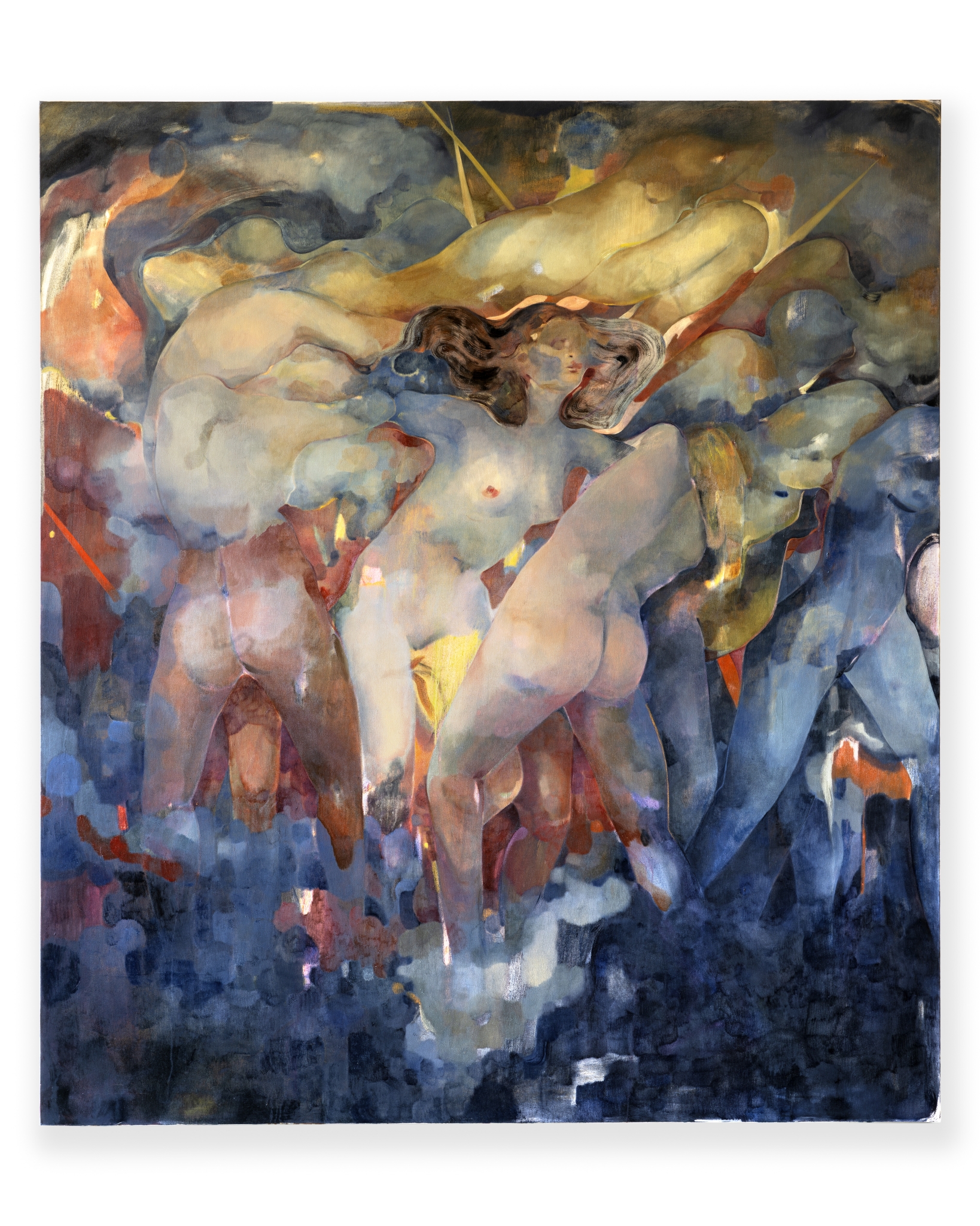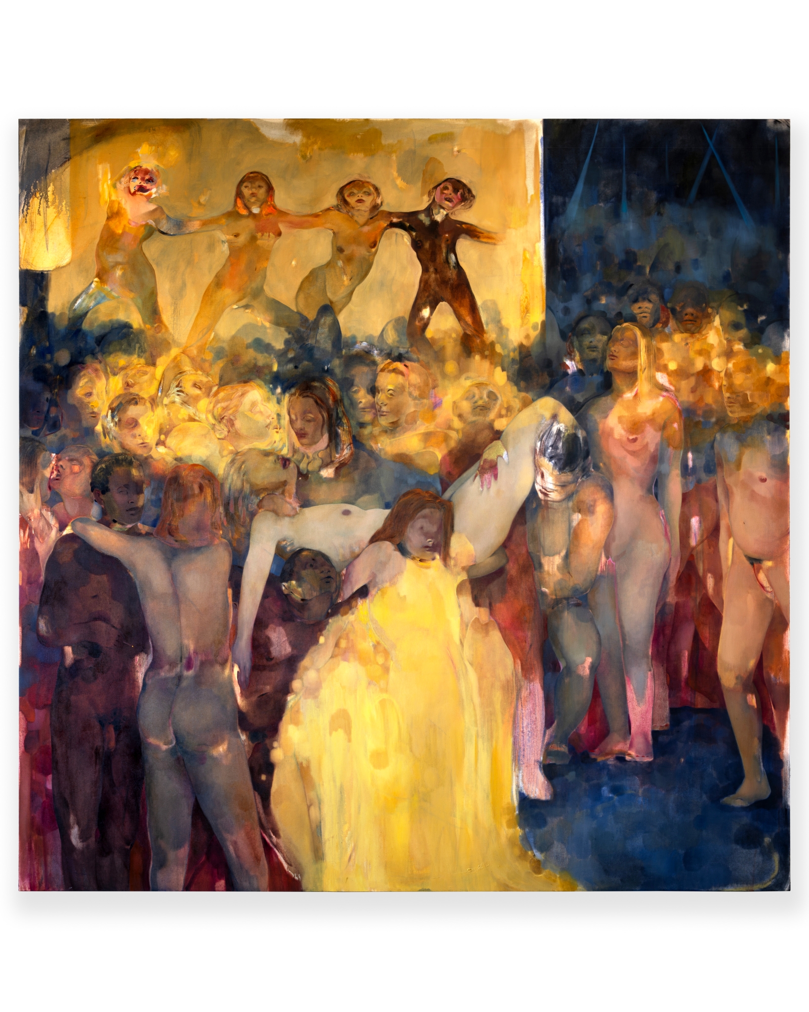 A golden haze, sweat and smoke, the vibrations of pulsating music, and the flickering of a distant strobe light—the sensuous paintings of Eva Helene Pade allude to the heady atmosphere of a nightclub. Relishing in primal, earthly pleasures, her large-scale paintings also point to something mythical; unfolding human narratives existing at the liminal threshold of fantasy and reality. These works are intoxicating dreamscapes that defy categorisation.