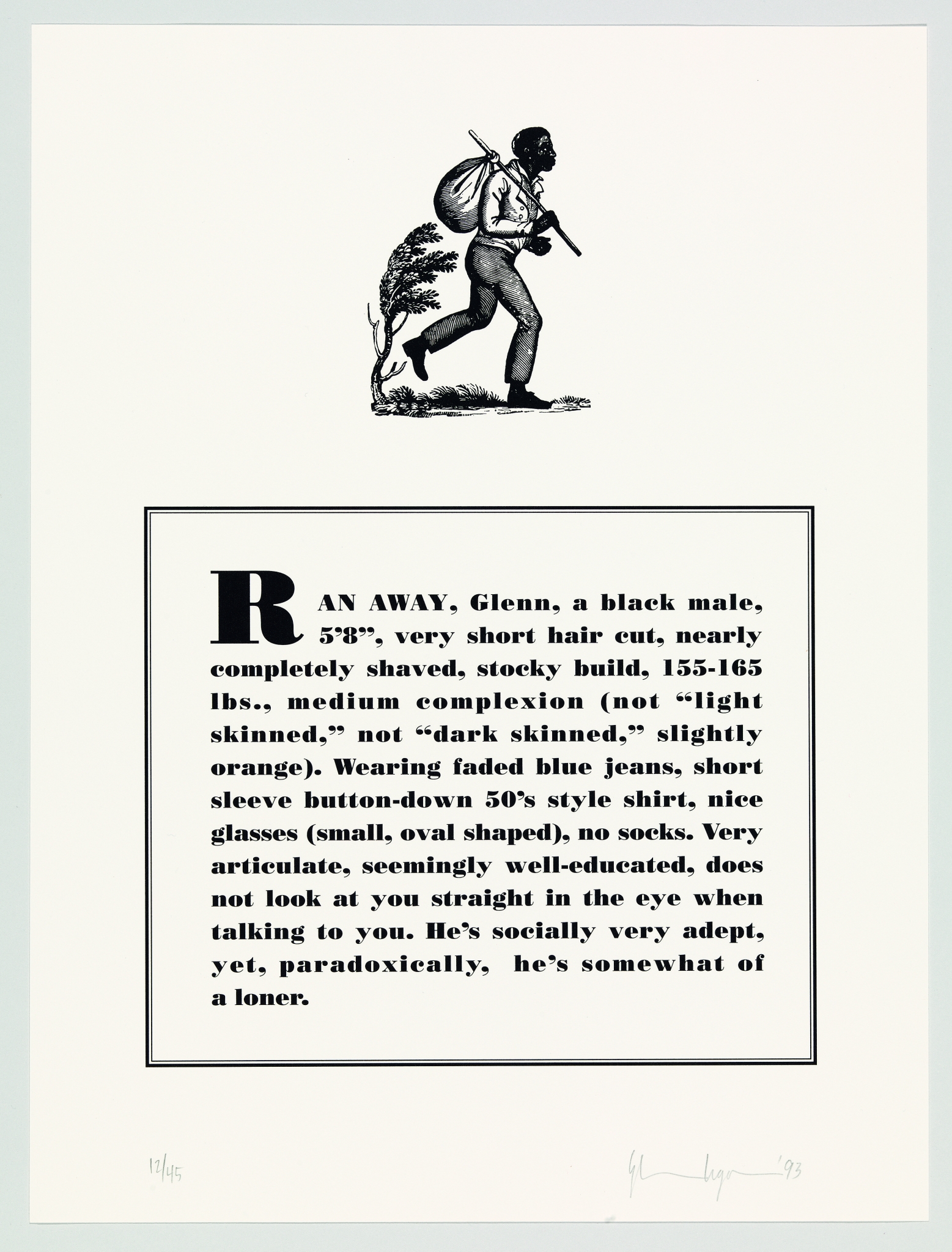 Glenn Ligon, Runaways (detail) (1993), suite of 10 lithographs, 16 x 12 inches (40.7 x 30.5 cm); Edition of 45 and 10 APs. Copyright Glenn Ligon. Courtesy of the artist, Hauser & Wirth, and Thomas Dane Gallery; Photographer credit: Jeff McLane