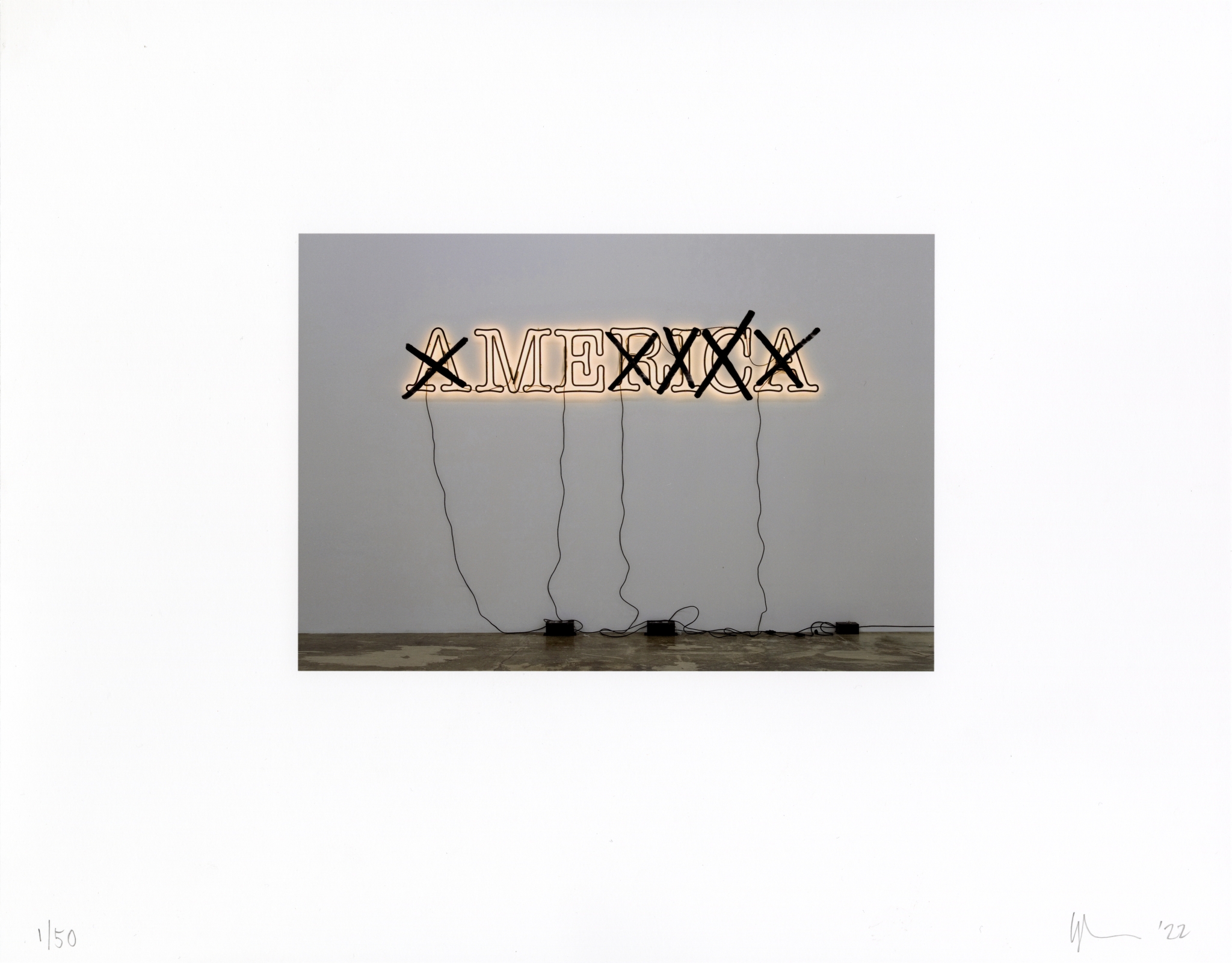 Glenn Ligon, Untitled (America / Me) (2022), digital image with hand-drawn additions, Edition of 50 and 10 APs. 27.9 x 35.6 cm / 11 x 14 inches. Copyright Glenn Ligon. Courtesy of the artist, Hauser & Wirth, and Thomas Dane Gallery