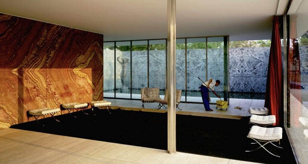 Yet Wall is no street photographer. Whilst rooted in reality, his images are rigorously composed and staged, inflected with a touch of the uncanny. Milk (1984) depicts a man sitting strangely on a pavement, seemingly oblivious as his titular beverage sprays in the air. Overpass (2001) shows three people in an industrial landscape walking with suitcases away from the camera. Morning Cleaning, Mies van der Rohe Foundation, Barcelona (1999), shows a man mopping the floor of a luxurious building – his back turned away from the gorgeous sunlight on the marble wall. In An Eviction (1988/2004) is a wide perspective image depicting an ordinary suburban street. A bust-up between cops and tenants is the focal point of pedestrian gazes, but appears as small in the frame as the central action in Pieter Breughel’s Landscape with the Fall of Icarus (c.1560).