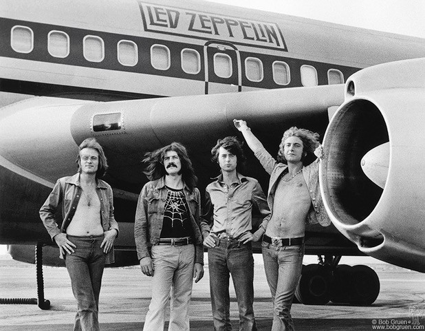 John Paul Jones, John Bonham, Jimmy Page and Robert Plant of Led Zeppelin in front of plane in NY. July 24, 1973. By Bob Gruen.