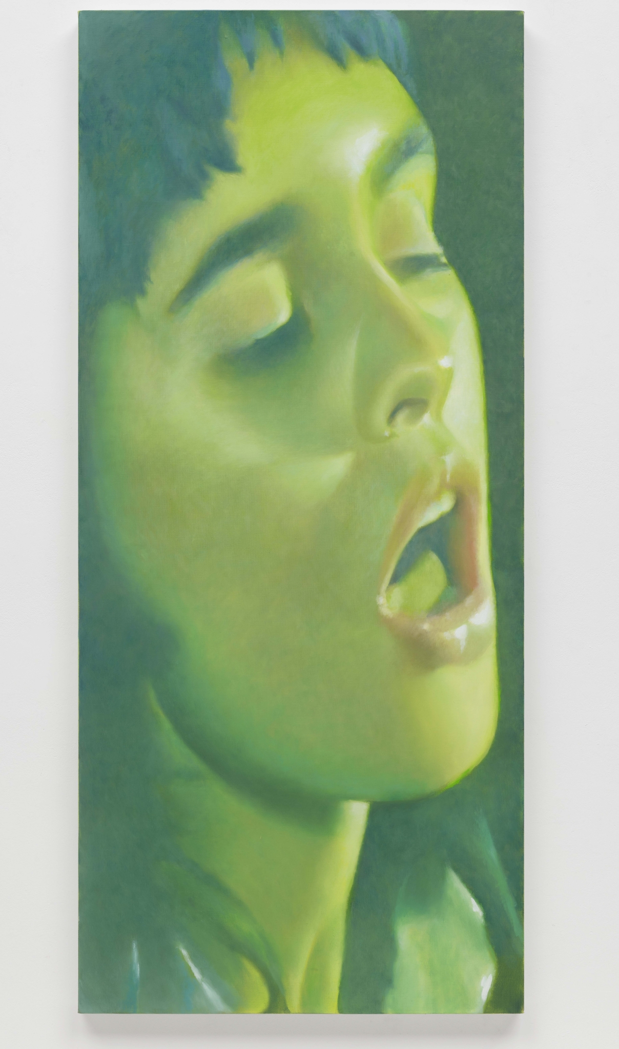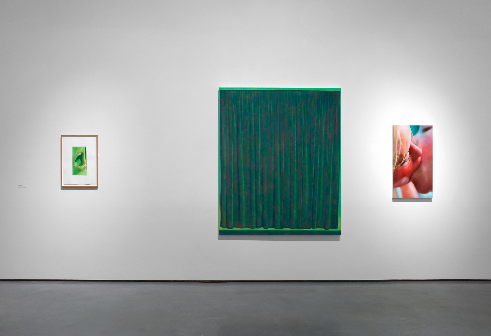 Curtains are significant for Giovanelli. Marrying her interests in the theatrical, the Renaissance and the tactile, they have become a kind of calling card for the artist: when an earlier solo show, ‘As If, Almost’, opened at White Cube in 2022, a lime green triptych called Prairie quickly materialised all over Instagram, its bold glow enrapturing both casual fans and habitual critics. Distinctive in their size, and similarly seductive, the drape paintings seem somehow wholly contemporary while alluding to centuries prior. In ‘A Song of Ascents’, Giovanelli’s new show at The Hepworth Wakefield, Scala is among five fresh commissions to depict curtains, a group that also includes the warm red velvet number, ‘Dado’, and ‘Decades’, a sparkly blue piece inspired by Denton Working Men’s Club.