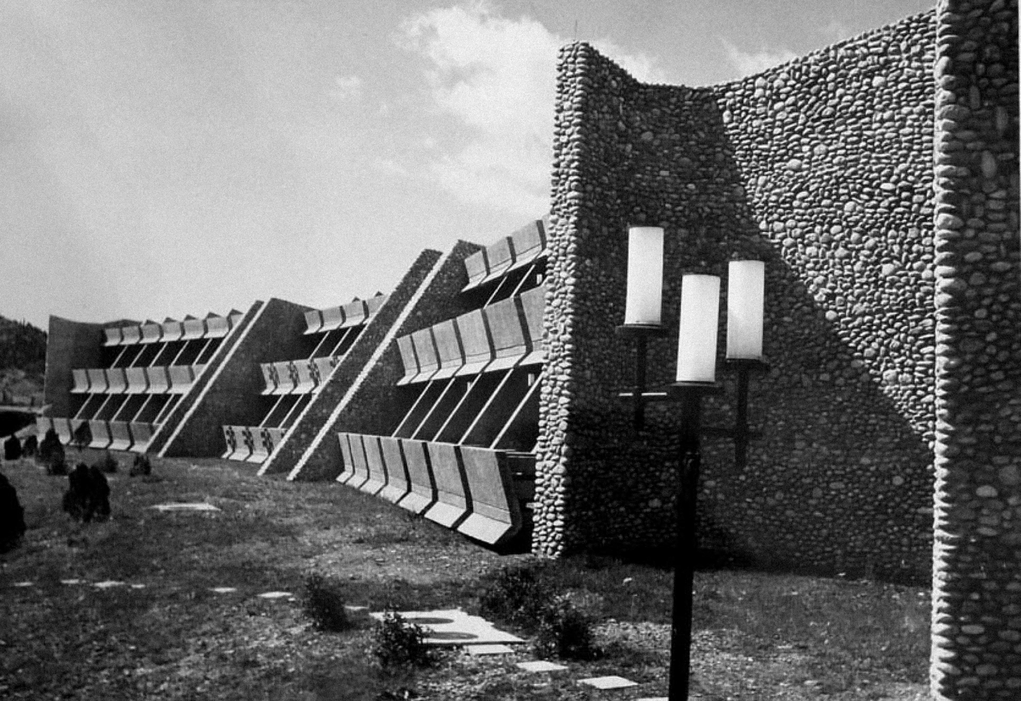 Still a child at the beginning of the post-war reconstruction of Montenegro, Radević went on to study under American architect Louis Kahn at the University of Pennsylvania before working at the office of Japanese architect Kisho Kurokawa in Tokyo. Demonstrating a de-centred internationalism sympathetic to the natural landscape, her sensitive works range in scale from furniture, interiors, and housing projects to her designs of Hotel Podgorica (1964-1967) in Podgorica, Montenegro, an elegant two-storey concrete structure on a cliff overlooking the Morača river and embellished with locally sourced river stones, and Hotel Zlatibor (1981), in Uzice, Serbia, a monumental high-rise that almost doubled in height from its original plan to be in alignment with the skyline of the nearby mountains. Awarded the prestigious Federal Borba Prize for Architecture for her design of Hotel Podgorica in 1967, she remains the only female and the youngest ever recipient of this honour. In beautiful symmetry with the prestigious commission of Corbet’s fictional architect Tóth, the pièce de résistance of Radević’s later works was her Monument to Fallen Fighters of Lješanska Nahija (1980) in Barutana, Montenegro, a memorial landscape arranged around a 12-metre tall sculptural flower in concrete and featuring her signature use of locally sourced stones.