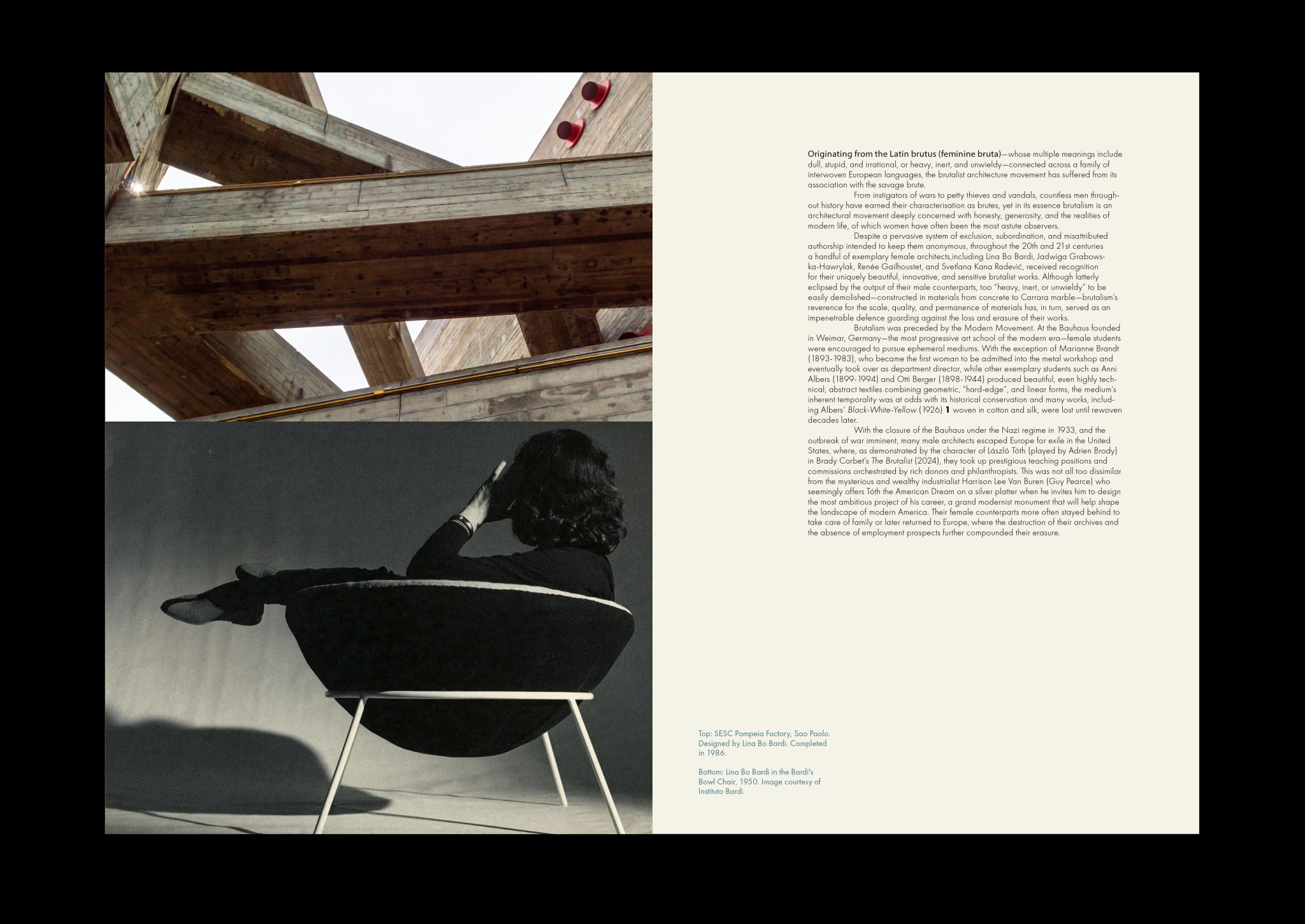 From instigators of wars to petty thieves and vandals, countless men throughout history have earned their characterisation as brutes, yet in its essence brutalism is an architectural movement deeply concerned with honesty, generosity, and the realities of modern life, of which women have often been the most astute observers.