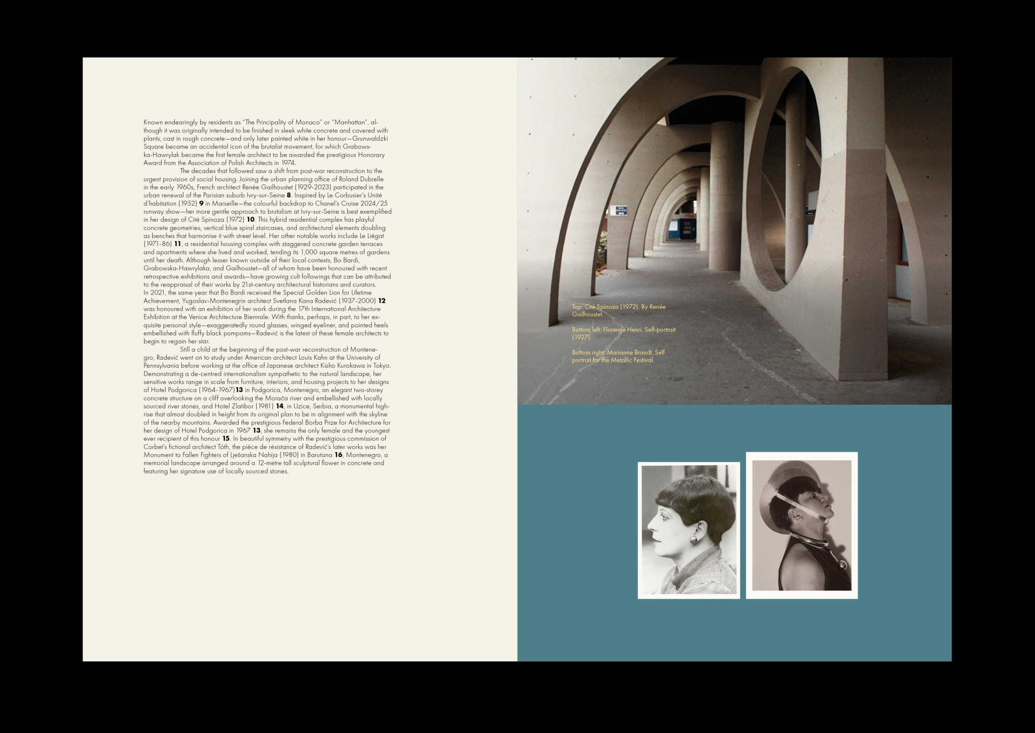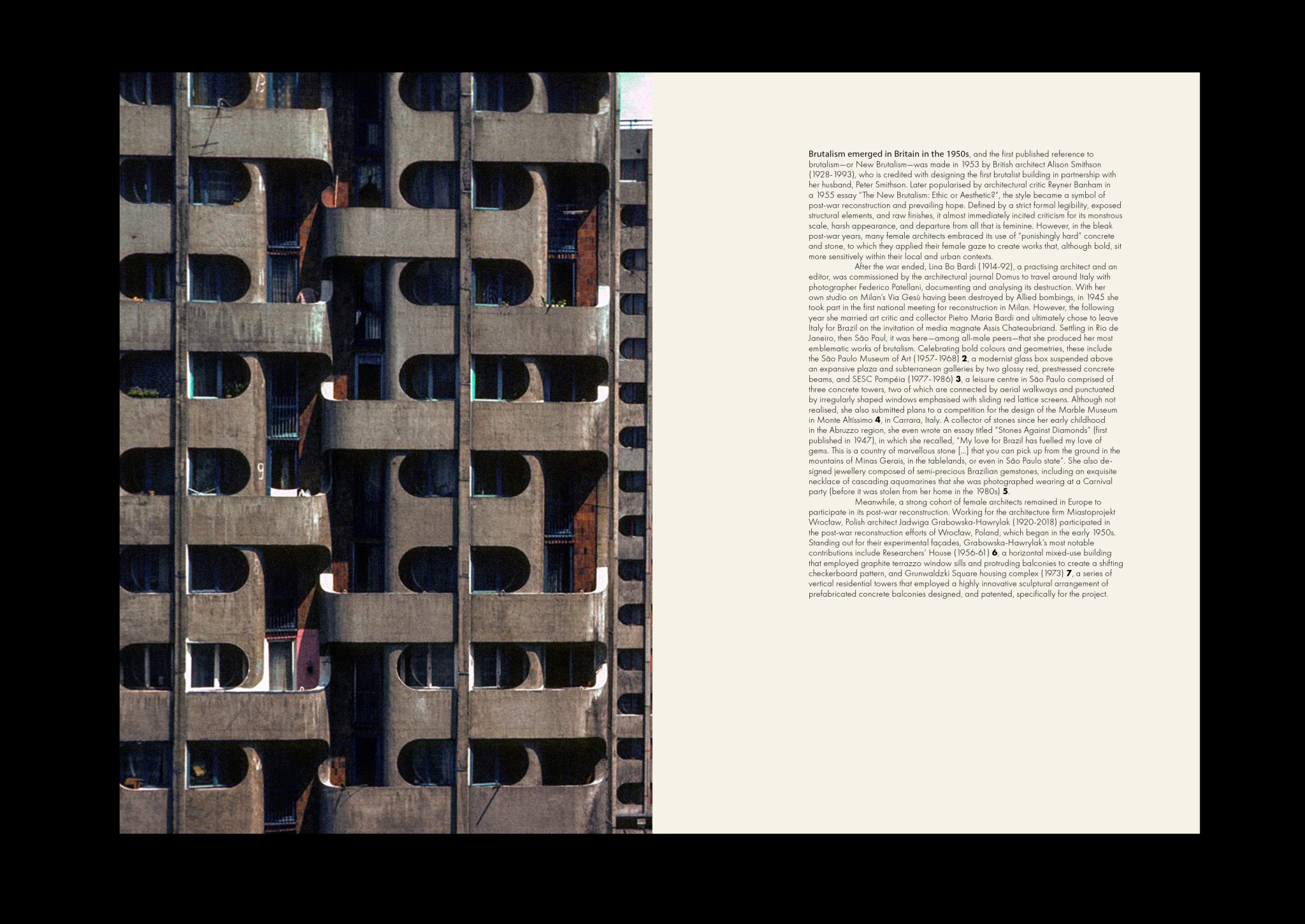 Despite a pervasive system of exclusion, subordination, and misattributed authorship intended to keep them anonymous, throughout the 20th and 21st centuries a handful of exemplary female architects, including Lina Bo Bardi, Jadwiga Grabowska-Hawrylak, Renée Gailhoustet, and Svetlana Kana Radević, received recognition for their uniquely beautiful, innovative, and sensitive brutalist works. Although latterly eclipsed by the output of their male counterparts, too “heavy, inert, or unwieldy” to be easily demolished—constructed in materials from concrete to Carrara marble—brutalism’s reverence for the scale, quality, and permanence of materials has, in turn, served as an impenetrable defence guarding against the loss and erasure of their works.