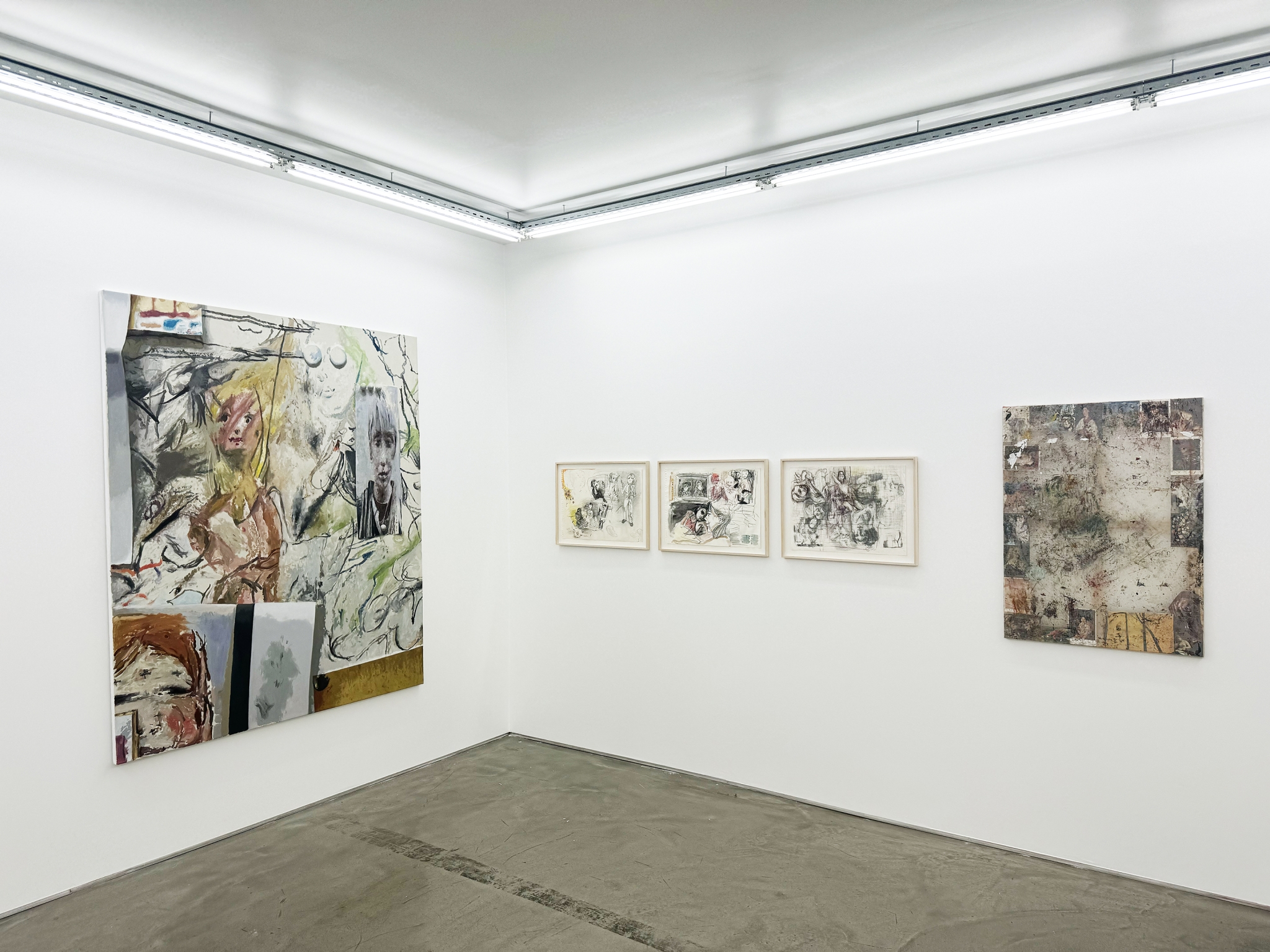 Toneatti’s compositions drift between figuration and abstraction, balancing instinct and precision, layering found imagery with gestural mark-making that destabilise its original context. Daughter at D’Orsay (2024) splices together historical references with contemporary interventions, while First World Wall (2025) plays with excavation, layering and obscuring meaning in equal measure.