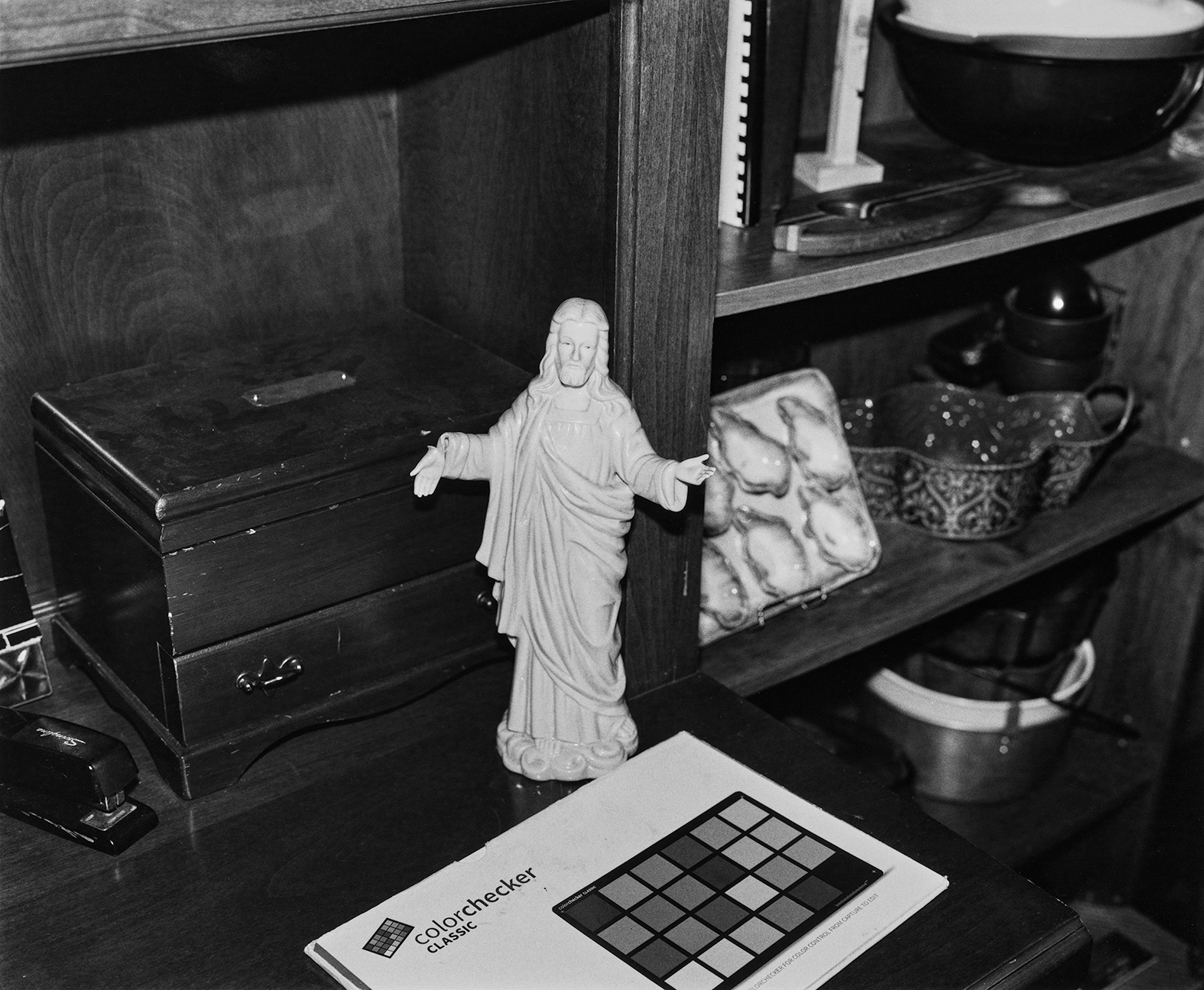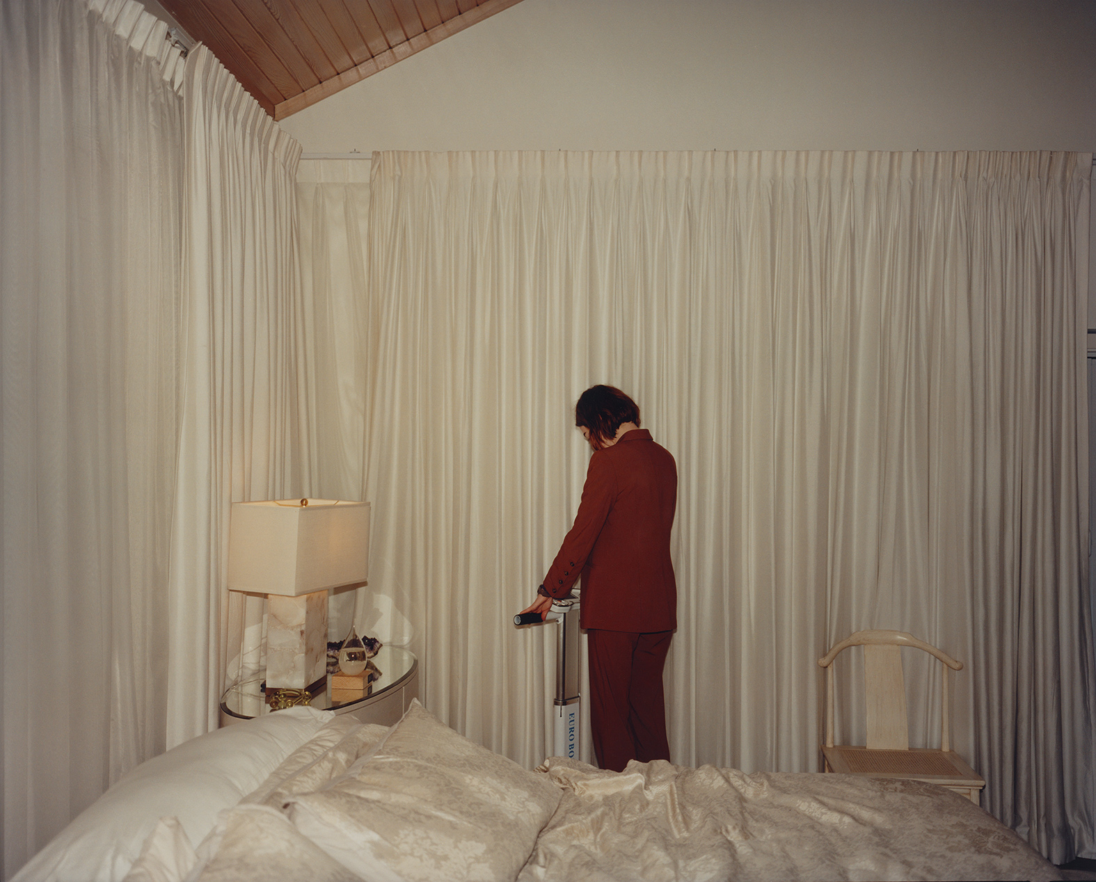 One of the best features of this book are the short texts written by Lanthimos himself, which construct new and rich stories that draw on the unsettling atmosphere of his cinema. They are like riddles that surround the eerie, the sexy, the surreal, and the endlessly fascinating images gathered here. My favourites are of Jesse Plemons standing in front of a large painting, and the strange, almost voyeuristic shots of empty pools, Christ statues, and strange rooms with long white curtains.