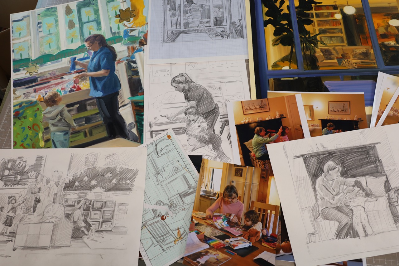 I’m still working with this imagery. The painting I finished yesterday shows my daughter at nursery. She’s older now, but I continue drawing on material collected over several years.