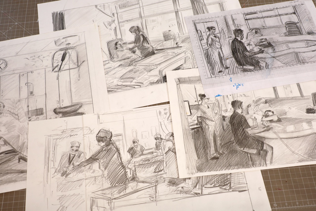 CW: The residency had been arranged before I was pregnant. I initially thought about painting nurses more generally, but I’d never spent much time in hospitals. We were about a year away from starting when I became pregnant. UCLH was my local hospital, so I began attending antenatal appointments there. I realised the maternity department was visually and emotionally unique — operating theatres, dark ultrasound rooms, birthing suites. It offered a rich range of settings connected to women’s labour — both medical work and childbirth itself.