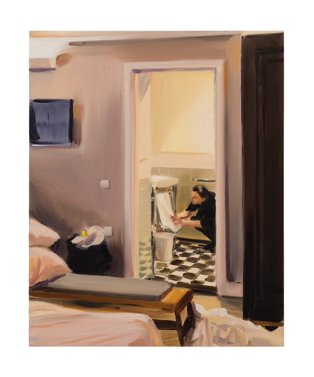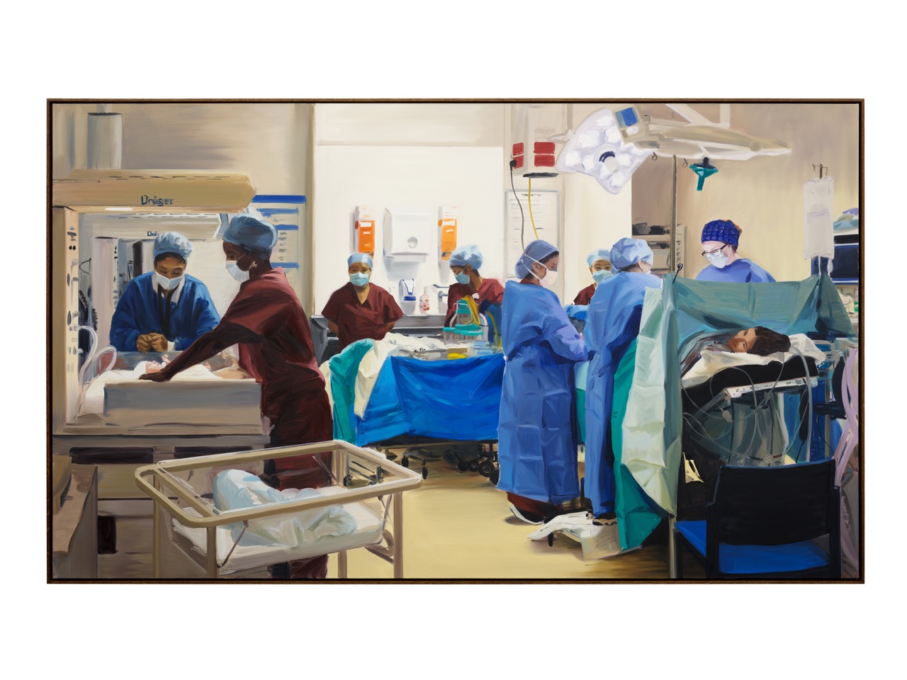 At the same time, my sister-in-law was expecting her first child and agreed to be the subject of the Lisa series. Her daughter was born just days before my residency began. I would spend one day photographing in the hospital and the next visiting Lisa at home. When I later made the paintings, I saw the two bodies of work as two sides of birth. In hospital, everything builds toward the moment of delivery. At home, the real transformation begins — the shift from institutional space to domestic rhythm.