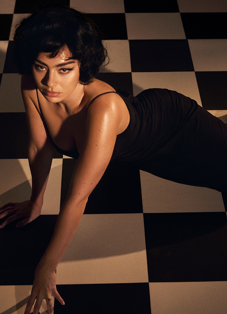 Fourteen years later, I find myself once again watching Charli at work—this time for a photoshoot at a studio in Downtown Los Angeles. Standing on a large chess board, Charli cranes her neck upward and glances into the lens of an old camera. Behind her, a sheet depicts a countryside backdrop. Around 30 people—all working on the photoshoot—crowd in silence to watch her perform an homage to the legendary Monica Vitti in a scene from La Notte (1961). And, like that, in front of our eyes, a (movie) star is (re)born.