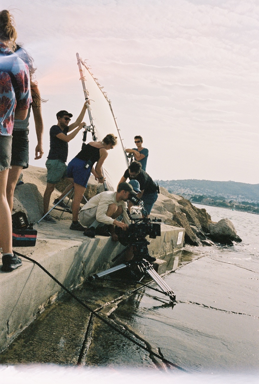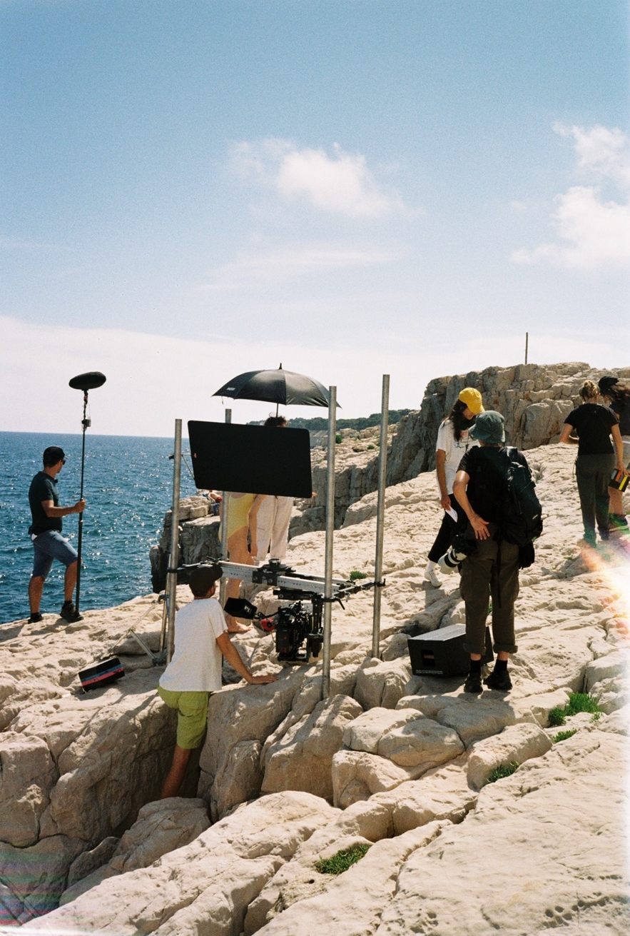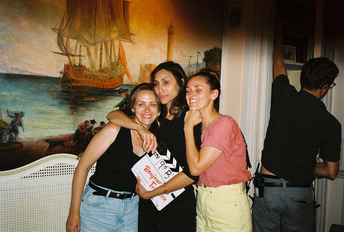 Durga Chew-Bose (middle) with her producers Lindsay Tapscott and Katie Bird Nolan behind the scenes of Bonjour Tristesse. By Marius Müller