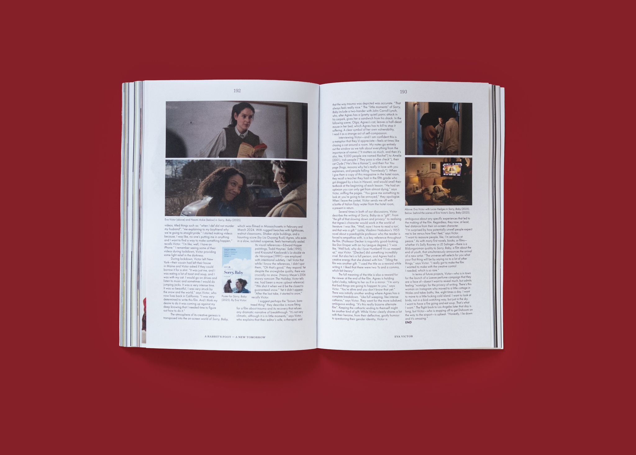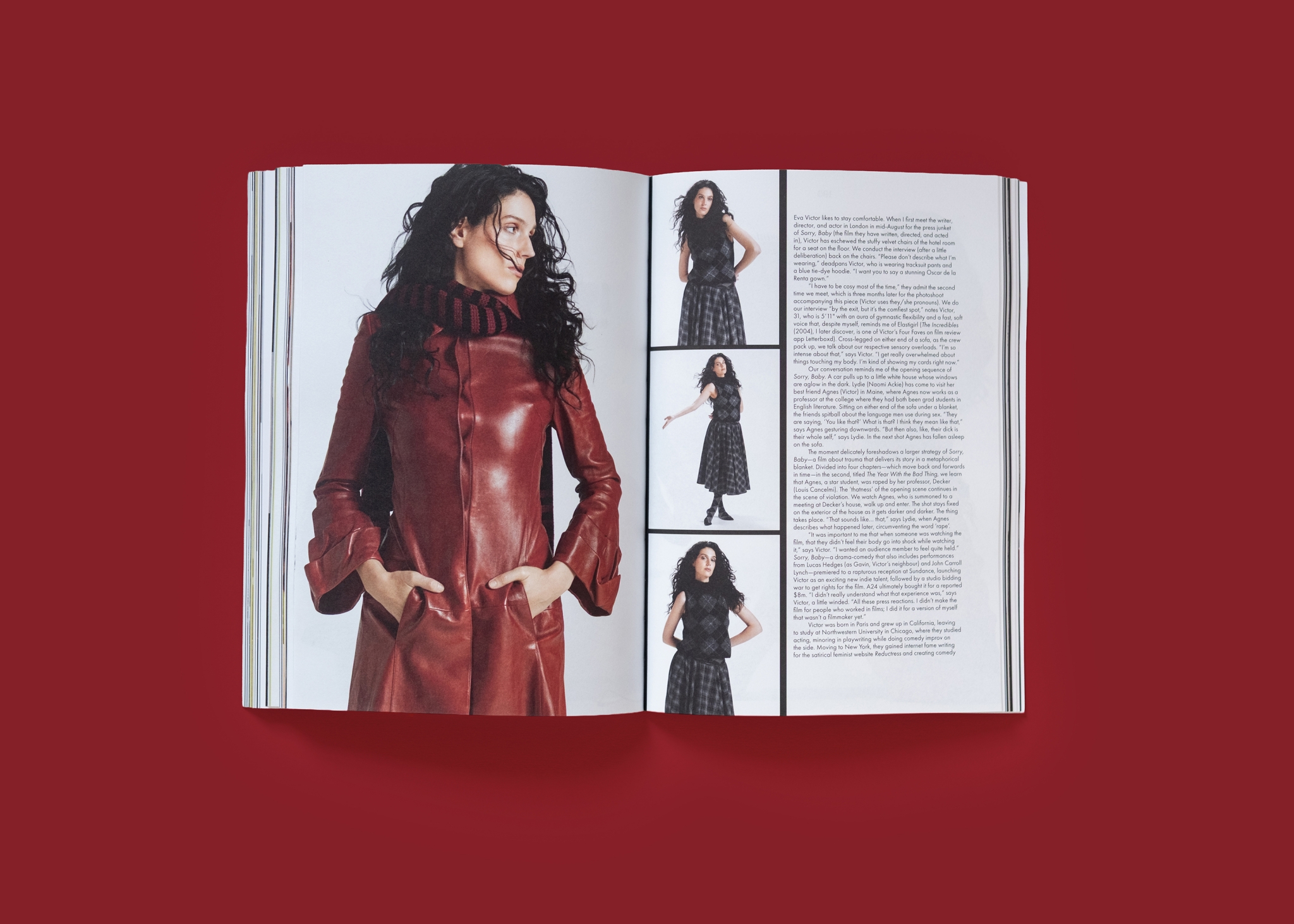 “I want to reassure people, like, I’m seriously at peace.” As with many first novels, books, or films— whether it’s Sally Rooney or JD Salinger—there is a Bildungsroman quality to Sorry, Baby, a film about the end of youth, that simultaneously announces the arrival of a new artist. “The universe self-selects for you what your first thing will be by saying no to a lot of other things,” says Victor. “I really got to make the film I wanted to make with the creative control I needed, which is so rare.”