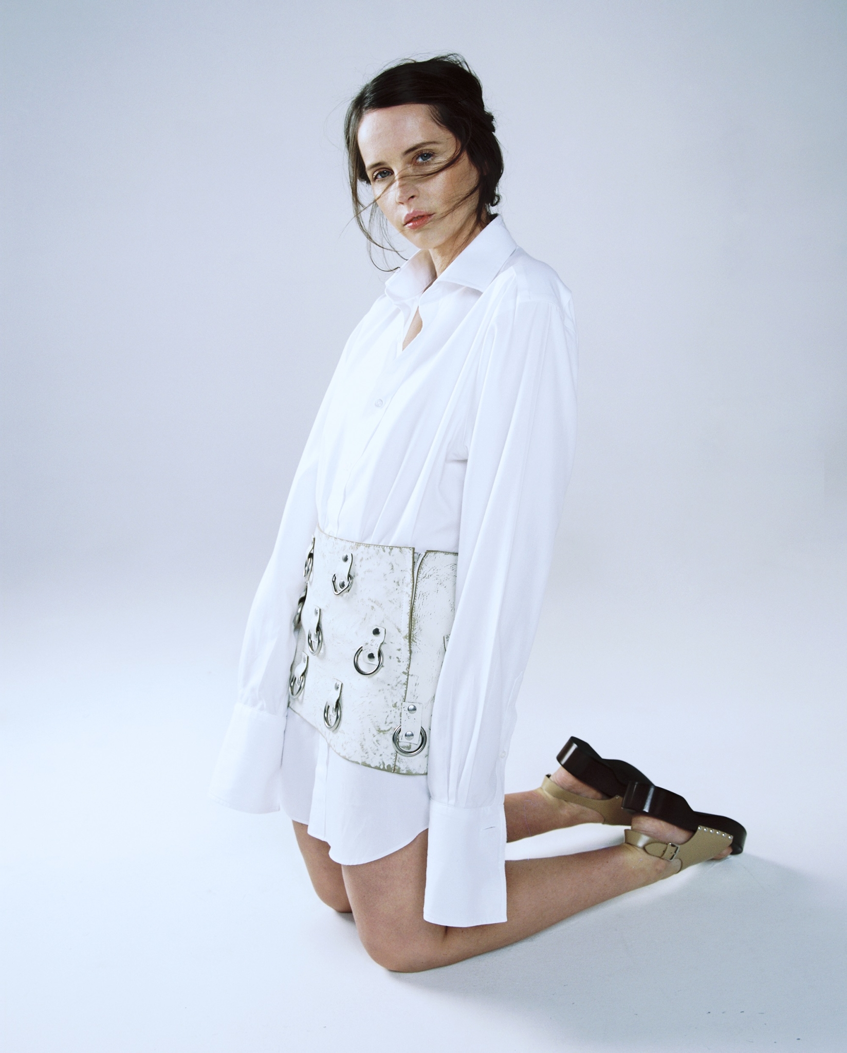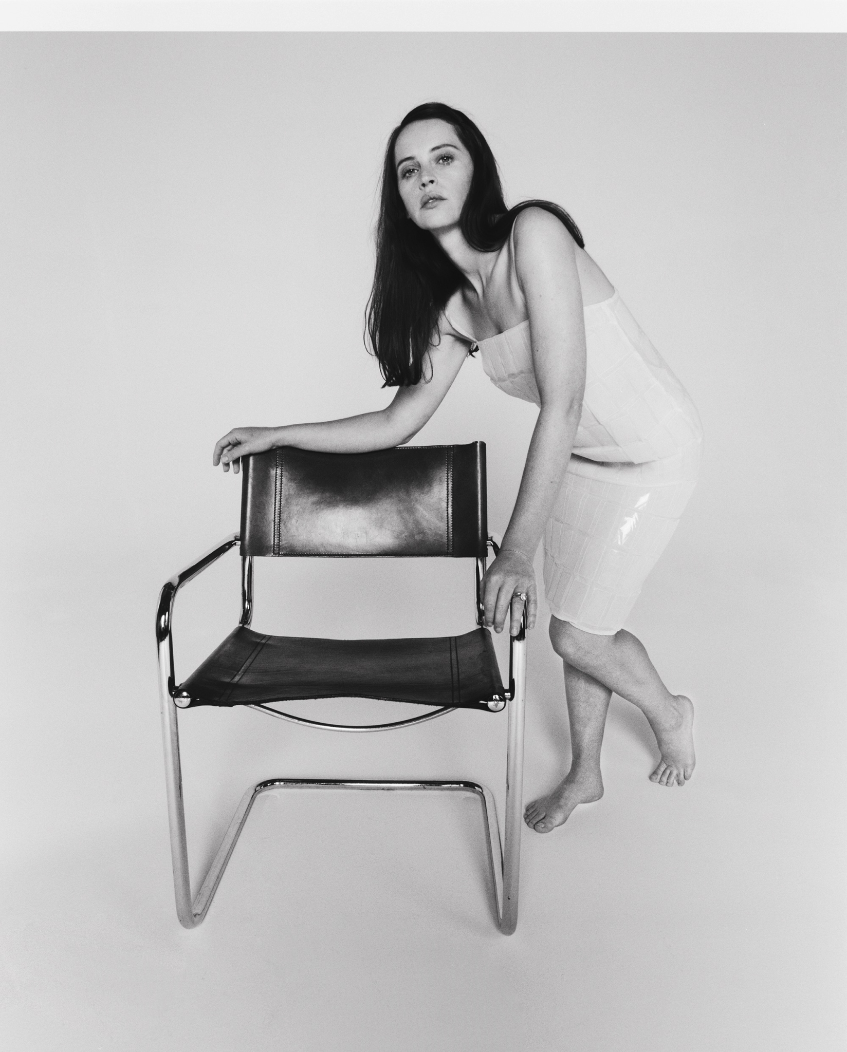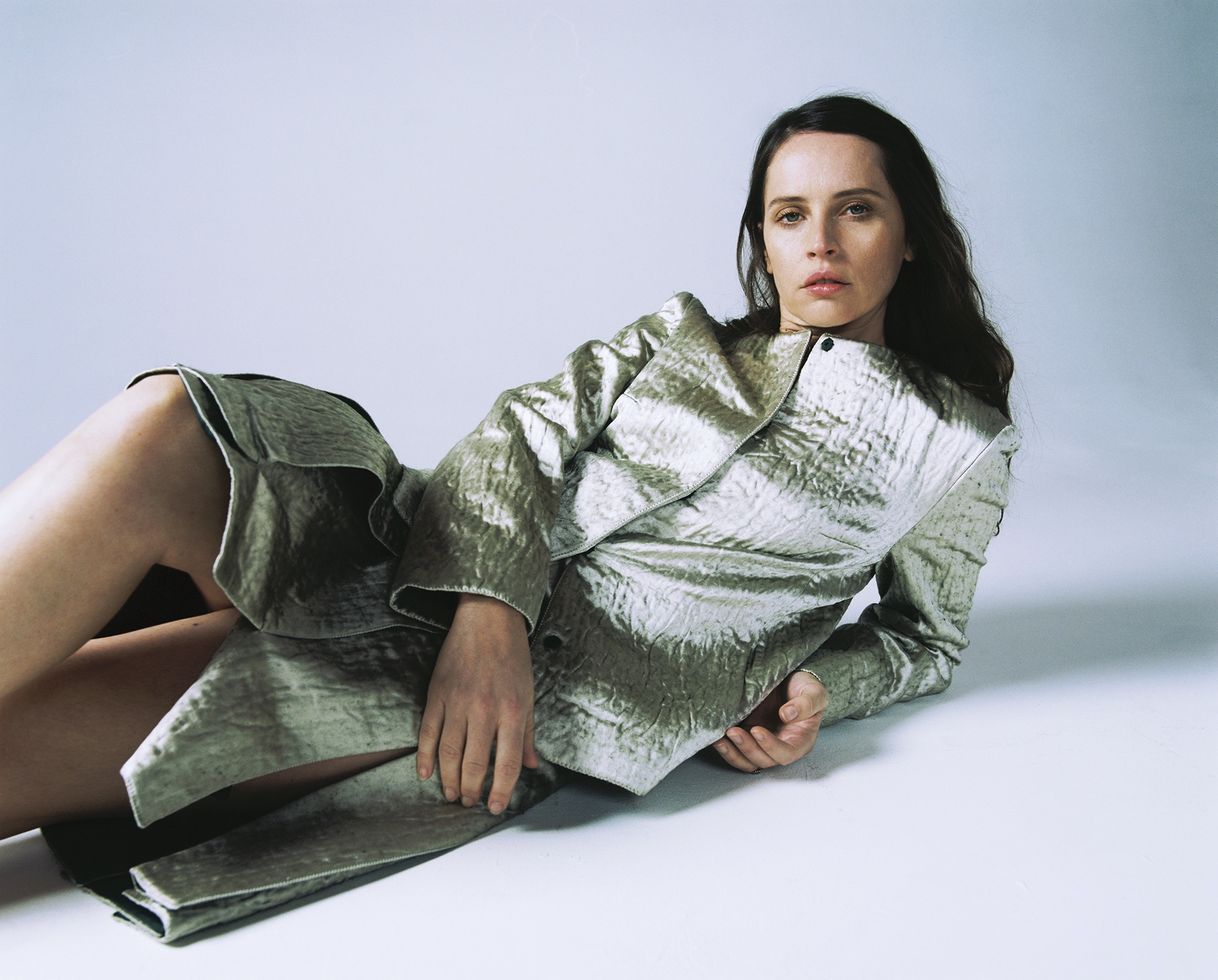 Felicity Jones photographed by Emma Picq. Prada FW 1998 Silver Silk Panelled Jacket and Skirt on loan from Baraboux, stylist’s own black pumps.
