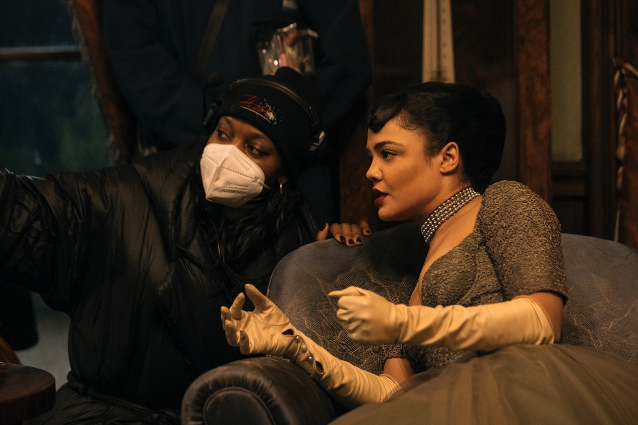 Director Nia DaCosta and Tessa Thompson on the set of Hedda.