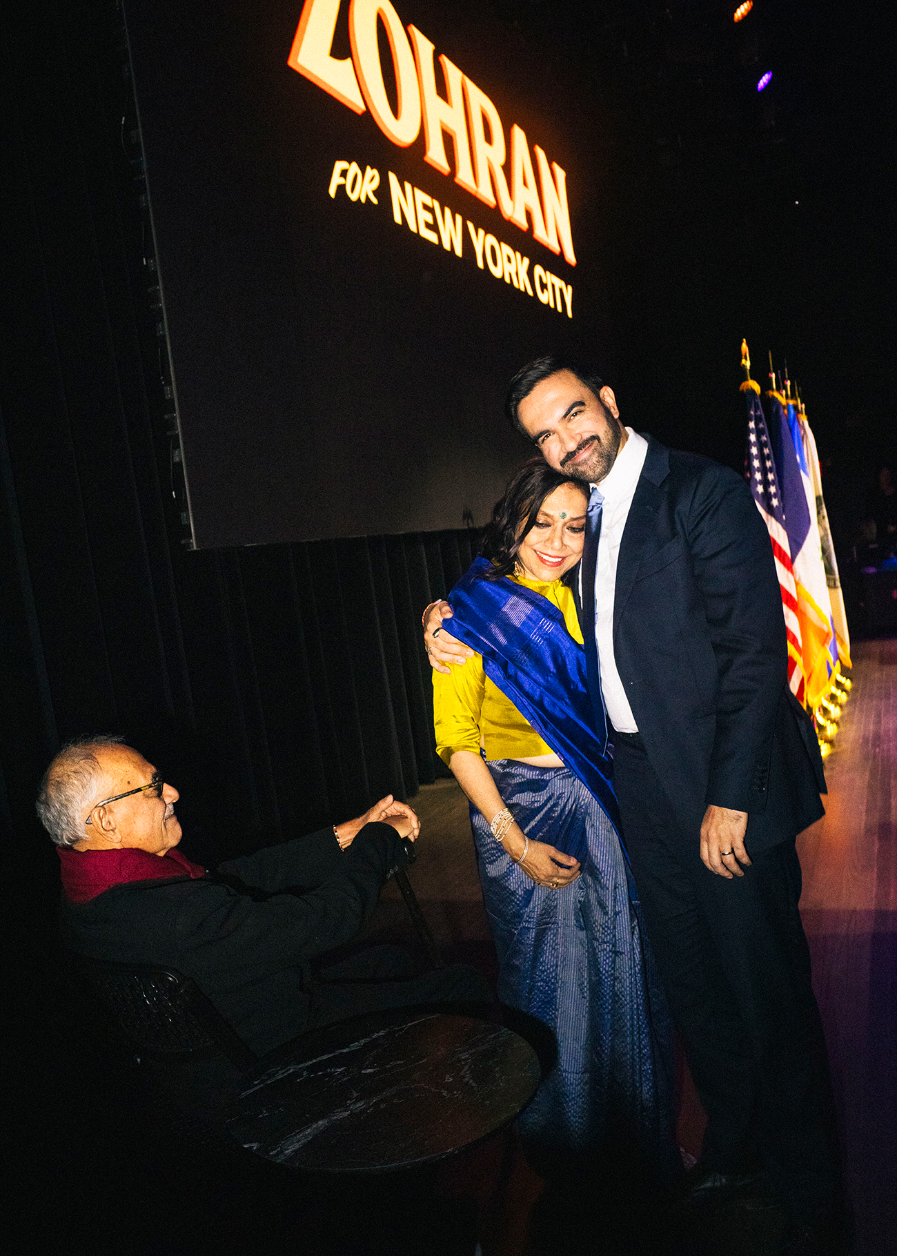 Mira Nair, Mahmood Mamdani, and Mayor-elect Zohran Mamdani on election night, 2025. By Sinna Nasseri.