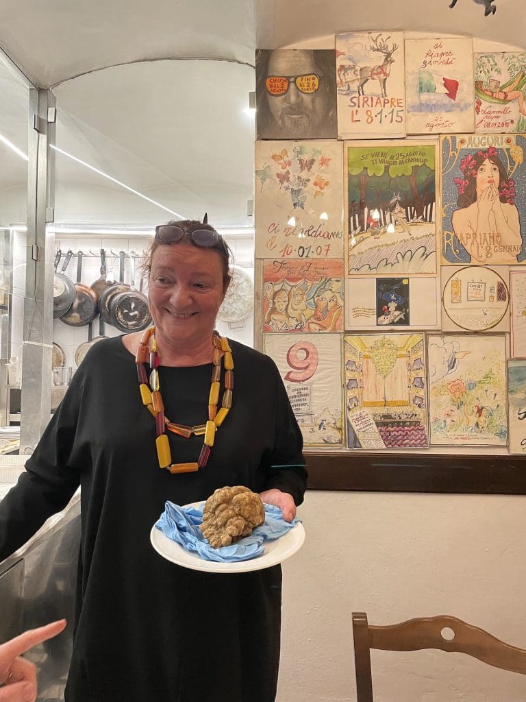 But Florentines will go a long way for good food. After the Germans blew up the entire area surrounding the Ponte Vecchio when retreating from the Allies in 1944, Chiara’s parents reopened in their current location one bridge further up. To this day the intoxicating, aroma of a plate of their buttery tagliolini with a generous shaving (10-15g at least) of white truffle attracts those in the know from far and wide. These earthy jewels are famously elusive, hence the high price, but Chiara’s trusted tartufai (truffle hunters) always reserve the best for her.