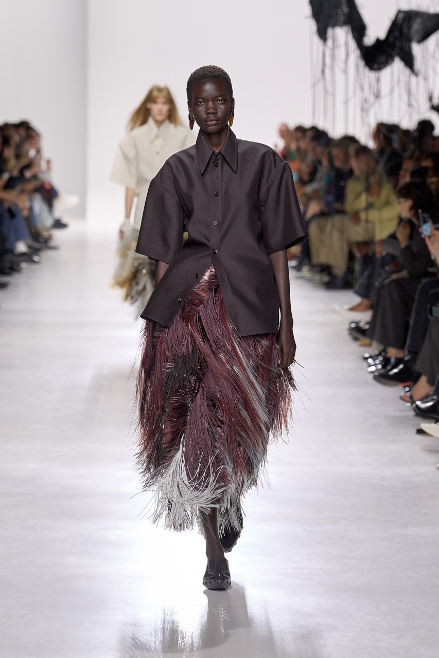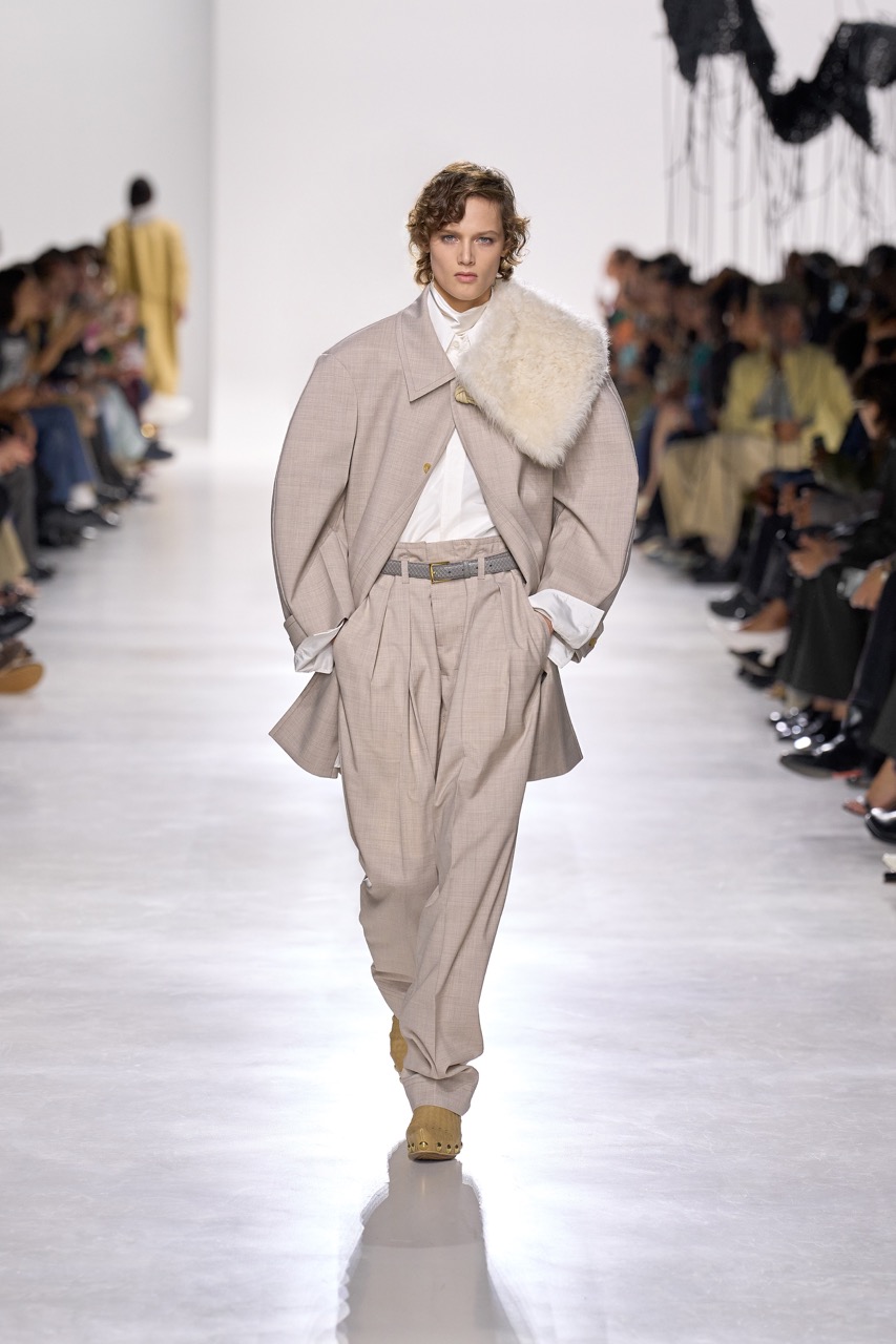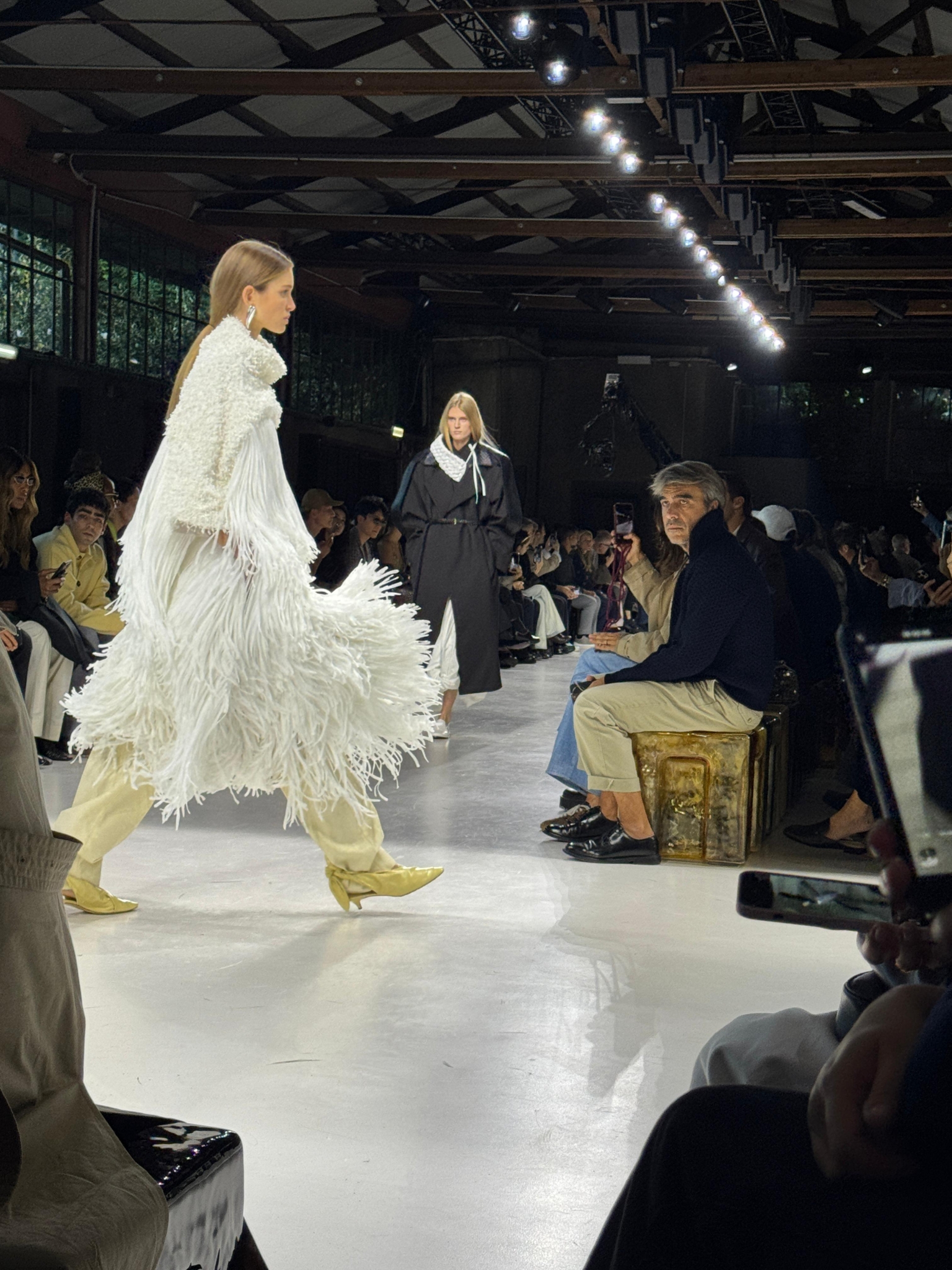 At around 5.30pm, the show gets going. The collection—which sees menswear looks interlaced into the womenswear—is lyrical and lovely, with serious clothes that still contain a free-spirit. And, as hinted with the invitation, bounce was key. Tassels and fringing everywhere. The Muppets appear as an unlikely reference by way of iridescent fringed coats and skirts that make models seem to ricochet, rather than walk, down the runway (no pictures or videos I’ve seen do justice to the beauty of their movement IRL). The colour combinations—like the seats—are particularly pleasing. Buttery yellows; minty and mossy greens; light pinks teamed with bright pinks; wonderful greys. Accessories stole the show, from collars to the clogs—in a variety of colours—which are bound to fly off the shelves. The ‘Veneto’—Trotter’s key new bag—is made from an oversize intrecciato and is designed to be held snugly under the arm. But in the meantime, Trotter proved that a newspaper—which models also held—can also serve as a smart accessory.