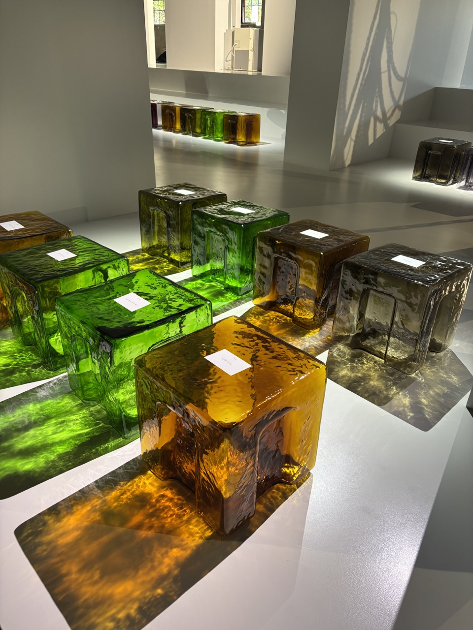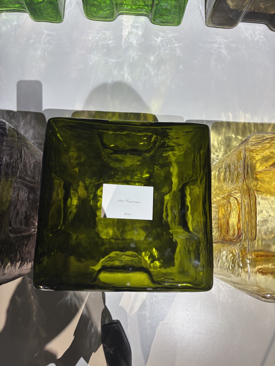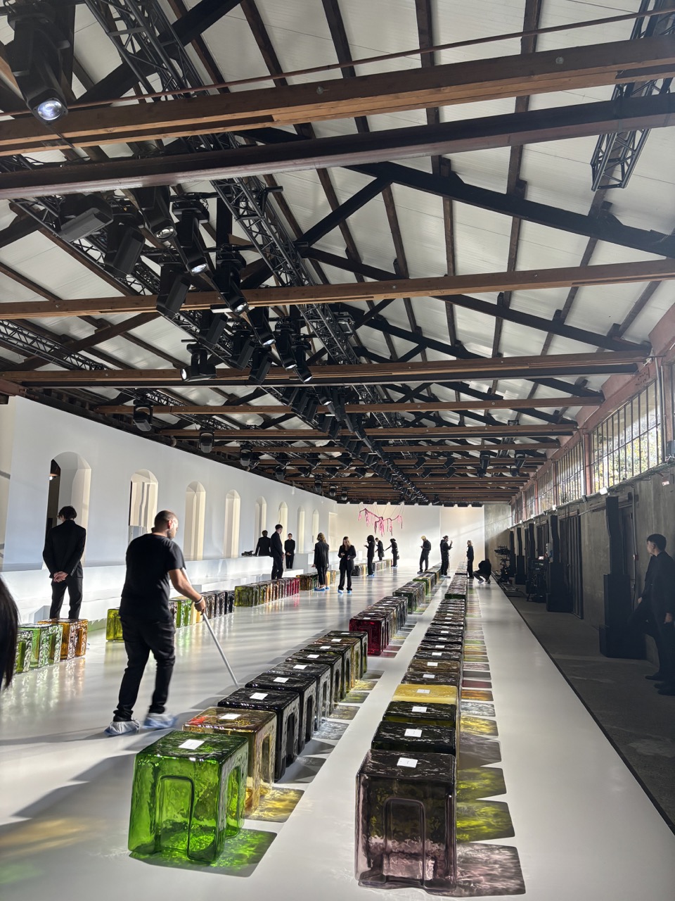The quiet street the show is located along was itself transformed into a runway of fans—and nothing quite prepared us for the sheer pandemonium on BTS boyband star RM’s arrival—and it’s nice to spot the odd person using their invitation as a bag. Inside, the sound of violins warming up played as the Bottega staff put the finishing touches to the scenography, which included mopping the pristine white runway. In terms of decoration, what seemed like a blown-up and deconstructed version of the show’s invitation hung as a sculpture from the ceiling (alongside another pink one), whilst the seats were glass cubes, as satisfyingly colourful and opulent as boiled sweets.