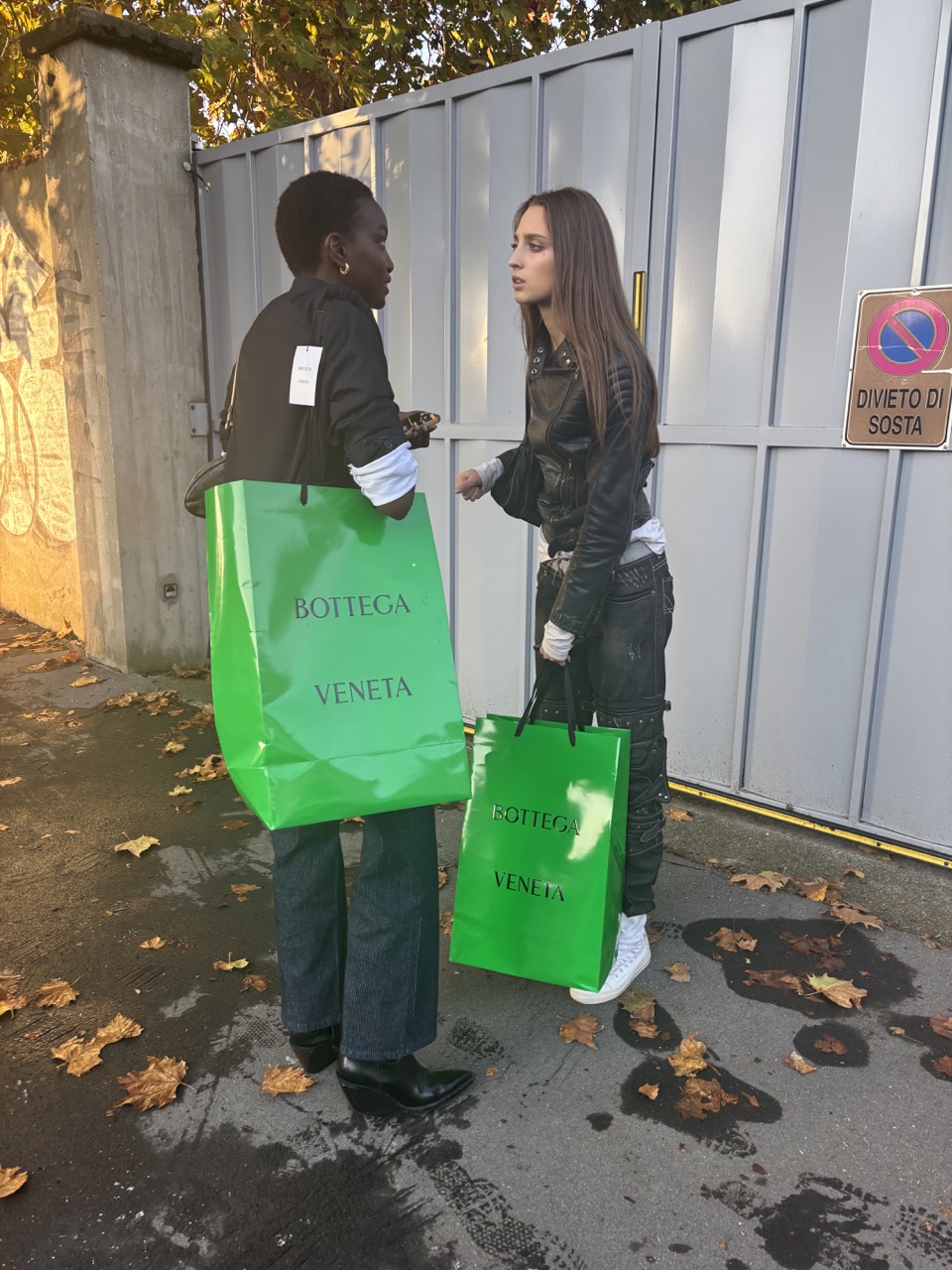 During fashion week, Milan feels like a village. The night before the show, our Creative Director Fatima Khan, Managing Editor Anna Pierce and I rendez-vous for dinner at Ristorante Nuova Arena, a delightful trattoria with pink walls and an excellent crème caramel in the Borgo degli Ortolani neighbourhood. Fatima recalled seeing Michelle Lamy the day before as well as throngs of K-pop fans outside her hotel and jokes that her new code word for a big dog is “giraffe”. It isn’t long before we spotted a few more “giraffes” in this supposedly under-the-radar restaurant. Former French Vogue Editor-in-chief Emmanuelle Alt was nestled in a back corner; Honey Dijon (due to perform at the Bottega afterparty a day later) took her place at the front.