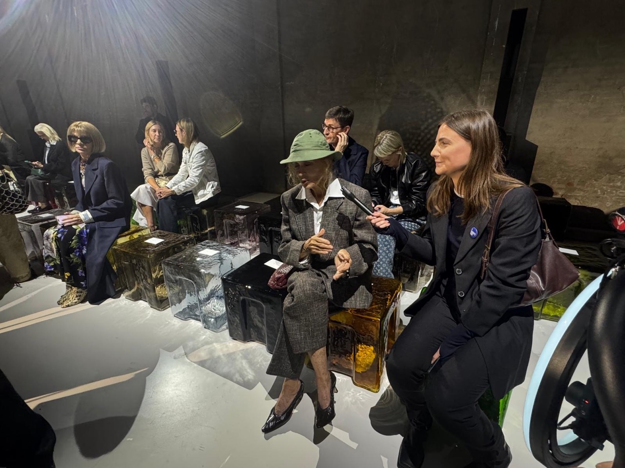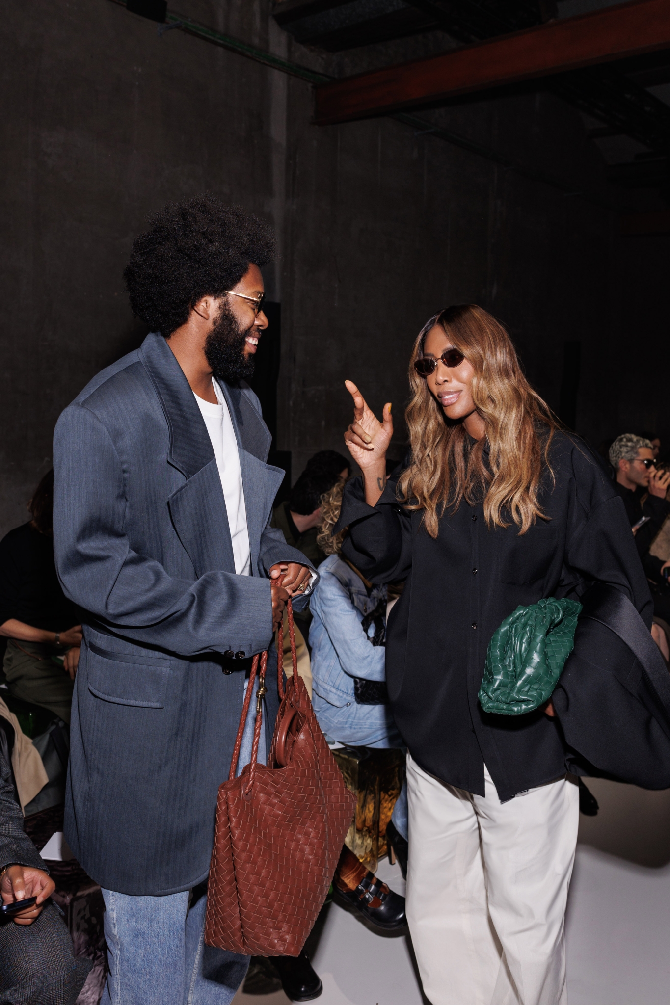 A particular fan girl moment of mine included seeing Zadie Smith—in full Bottega look—stopping to hug filmmaker Mati Diop (she later stopped by to say hello to Jack Antonoff). Fatima meanwhile is particularly happy to say hello to Interview’s Mel Ottenberg. Yet our team’s most anticipated guest was undoubtedly Lauren Hutton (who, deeply charming, tells me she is a fan of A Rabbit’s Foot.) She of course starred alongside Richard Gere in the 1980 film American Gigolo. The film was of course styled by Giorgio Armani (Gere and Hutton sat next to each other the next day at his first posthumous show) and Bottega Veneta. Hutton arrived on the front row wearing the same intrecciato blood red clutch and green hat that she had worn in the film 45 years earlier. The ‘Lauren’ clutch is back this season.