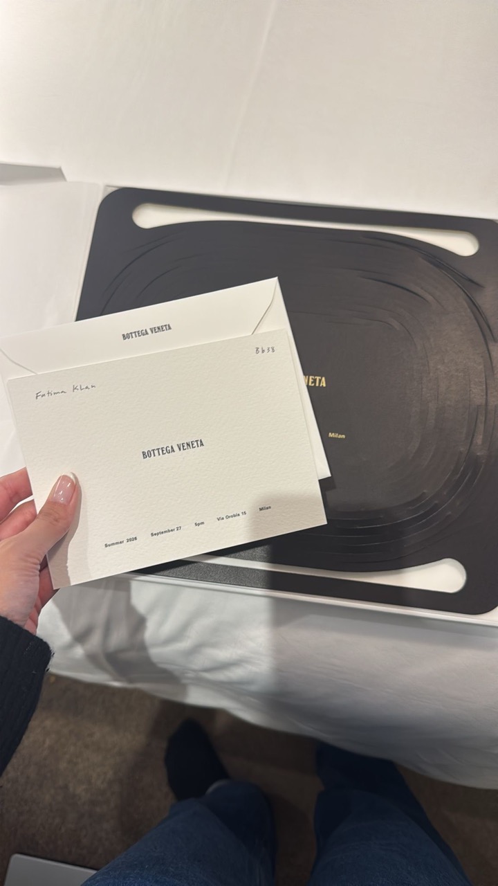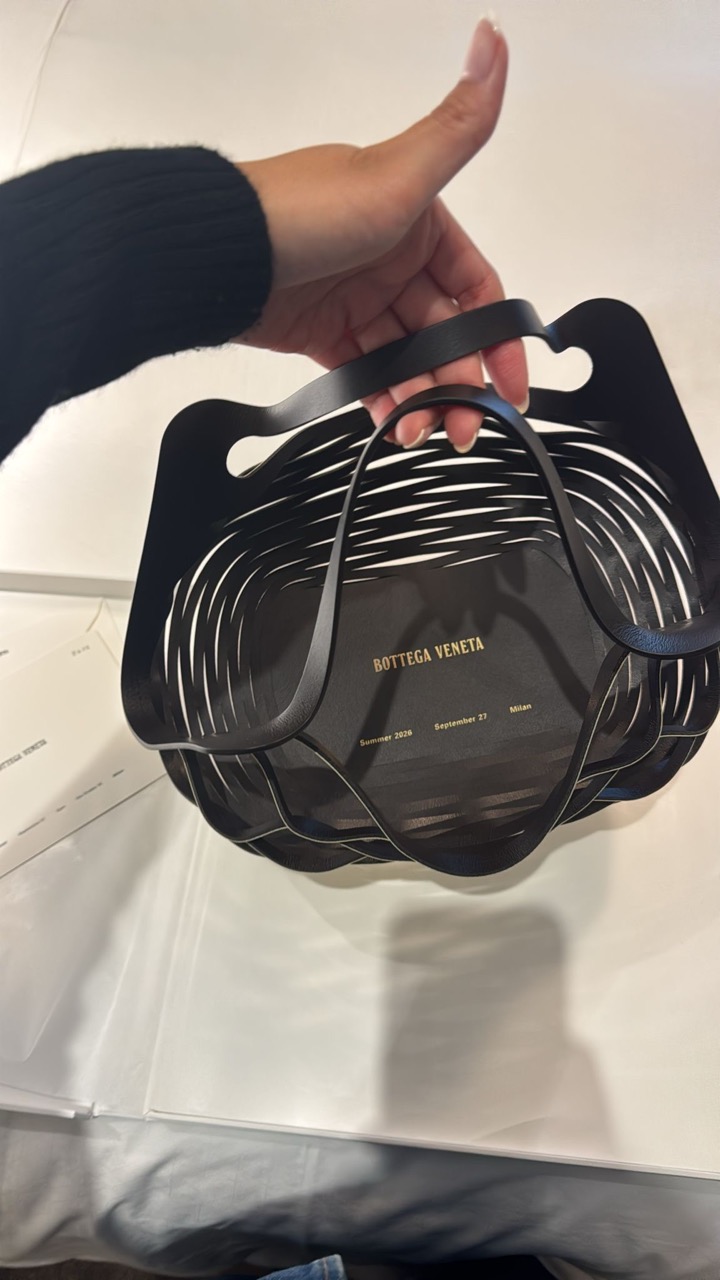 Invitees to the show, meanwhile, were met with another woven creation. Featuring a new logo from the house, the invitation, was a flat oval structure made from black leather that concertina-ed out to create a net-like bag. Knowing how seriously covetable Bottega leather goods are—it’s hard to imagine an invite with more cachet (or bounce).