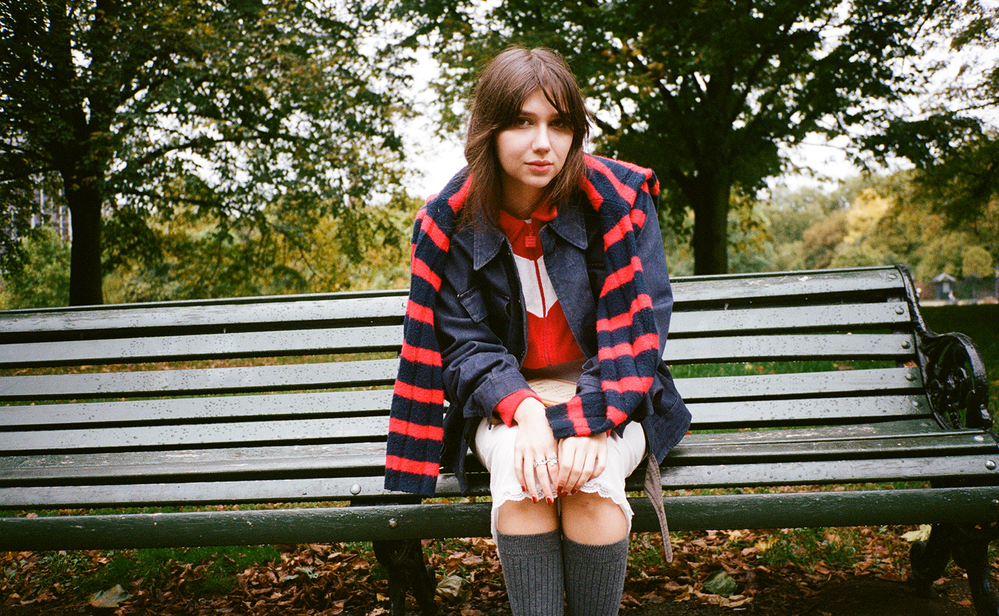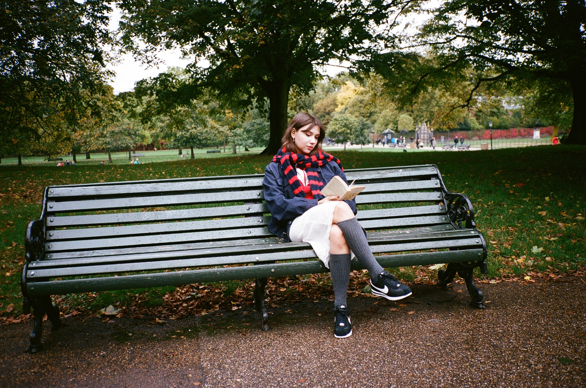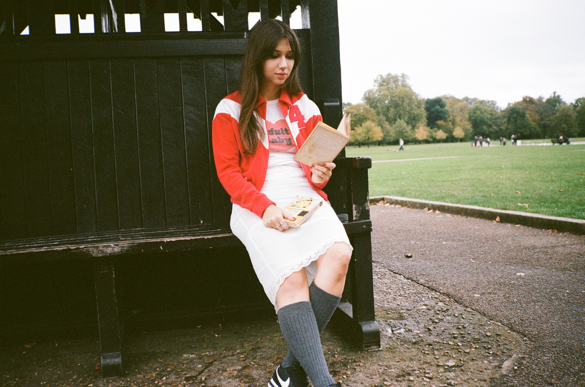 Look four: Red zip jacket and blue cotton jacket – Contemporary Wardrobe, stripe jumper – Stylist’s own, skirt- Shushu Tong, socks – Stylist’s own, shoes- Nike