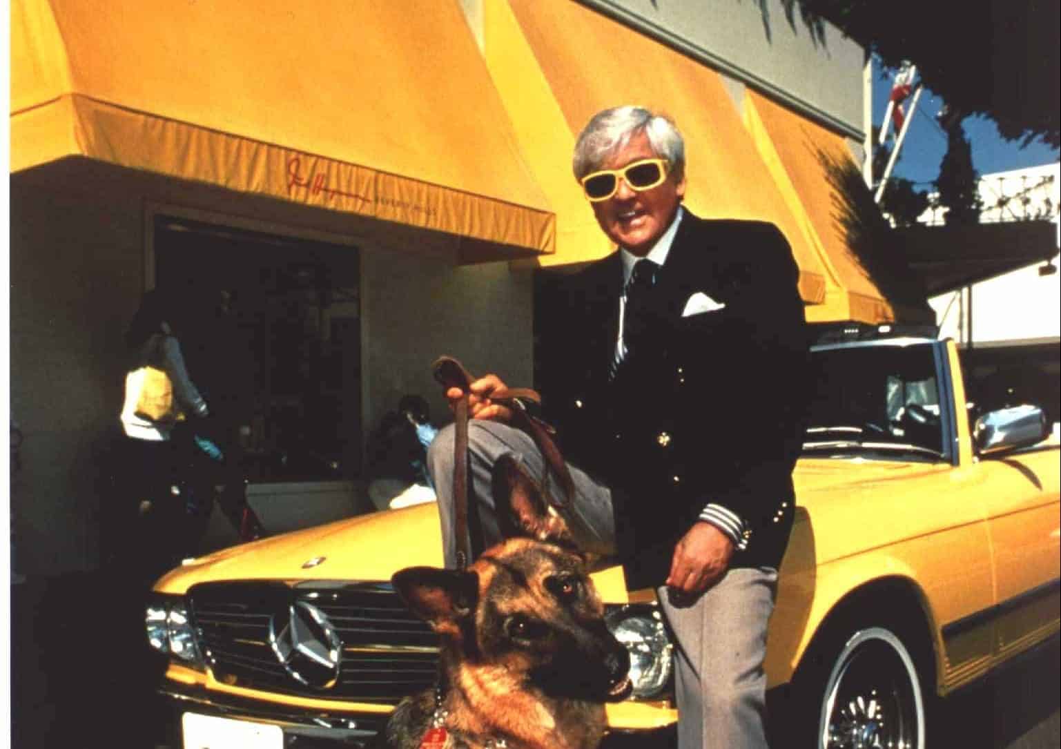 Featured image: Fred Hayman outside his famous store with his Alsatian ” Chumley” and yellow Mercedes convertible in 1993 (Photo By Paul Harris/Getty Images).