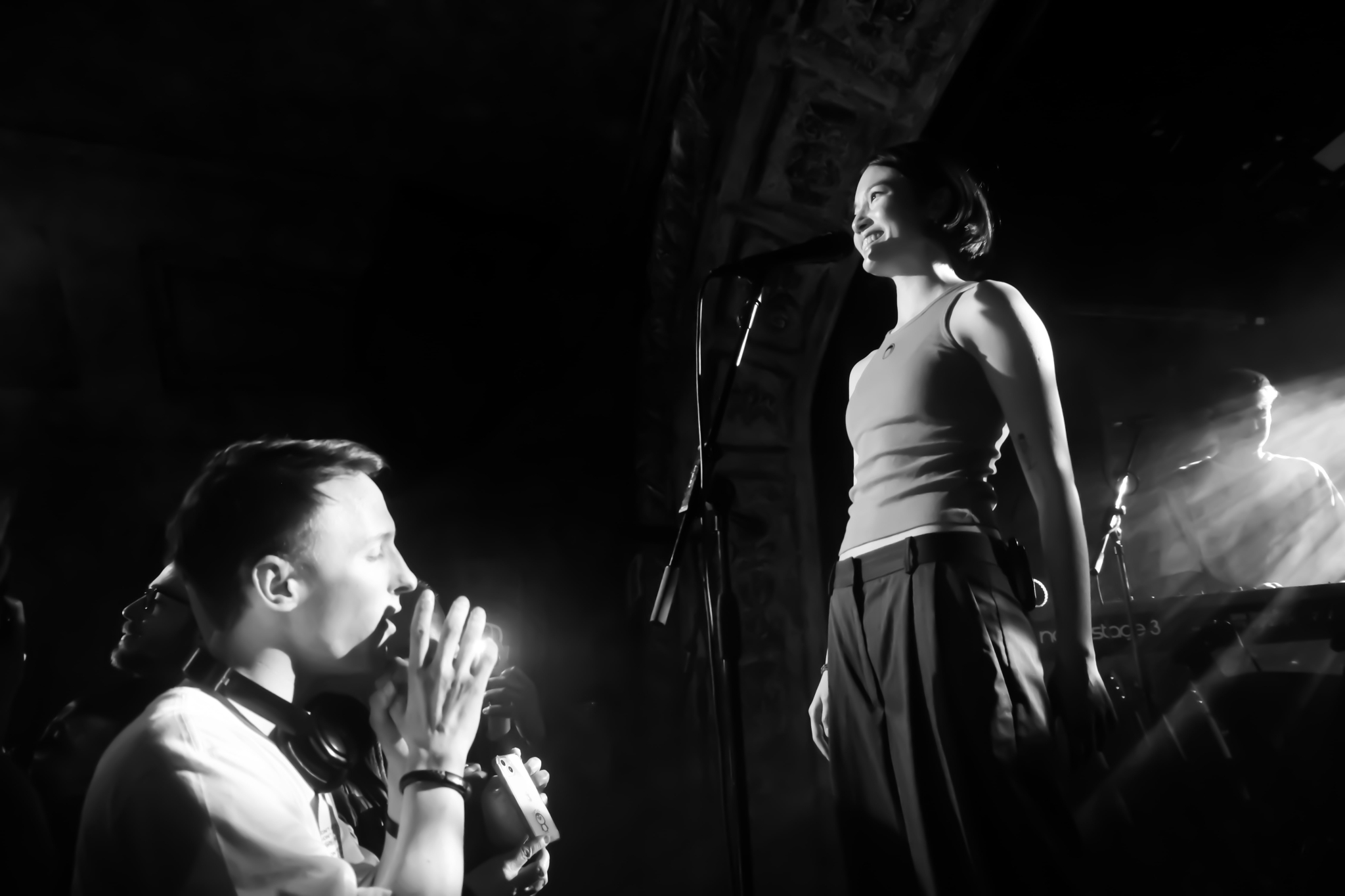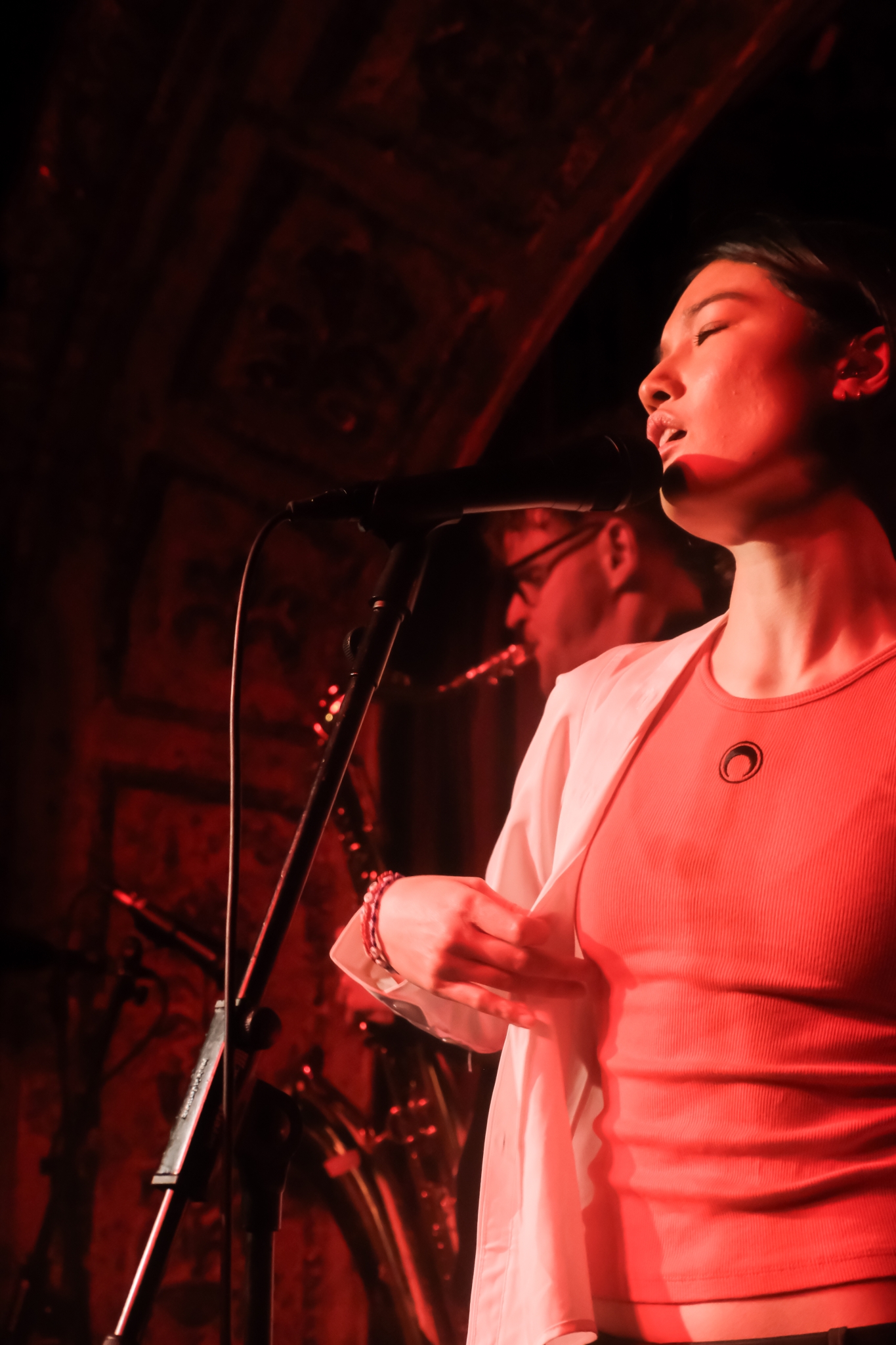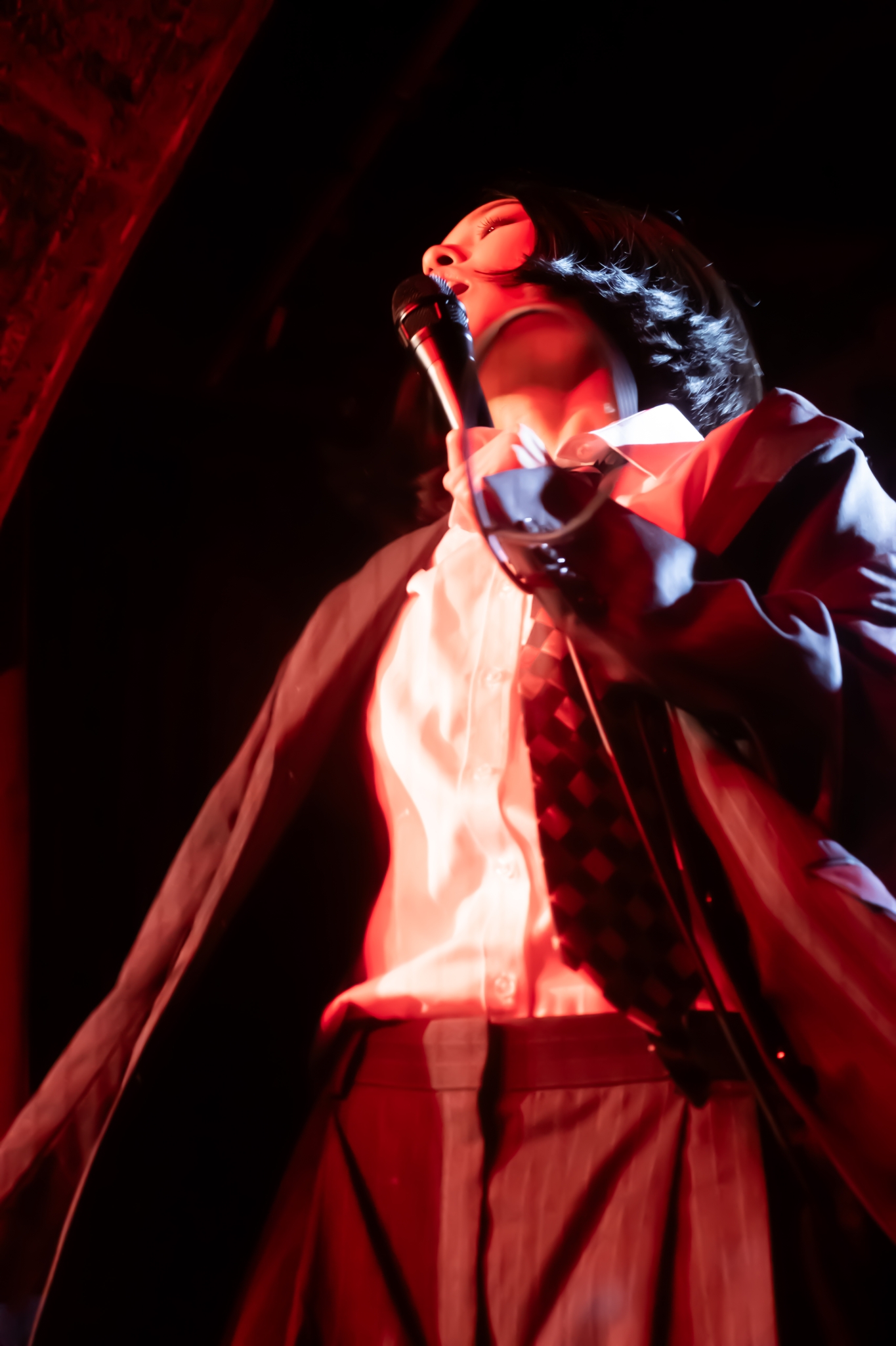 “Is it hot in here?”, Chloe Qisha pouts, a quarter of the way through her show at London’s OMEARA. The musician, playfully tugging at the collar of her oversized, pinstriped suit (à la David Byrne), is flirting with her crowd, and they, in turn, look just about ready to lay their lives on the ground for her. It’s the kind of onstage charisma and crowd-control you usually see from artists who have been on the gig-circuit for years.