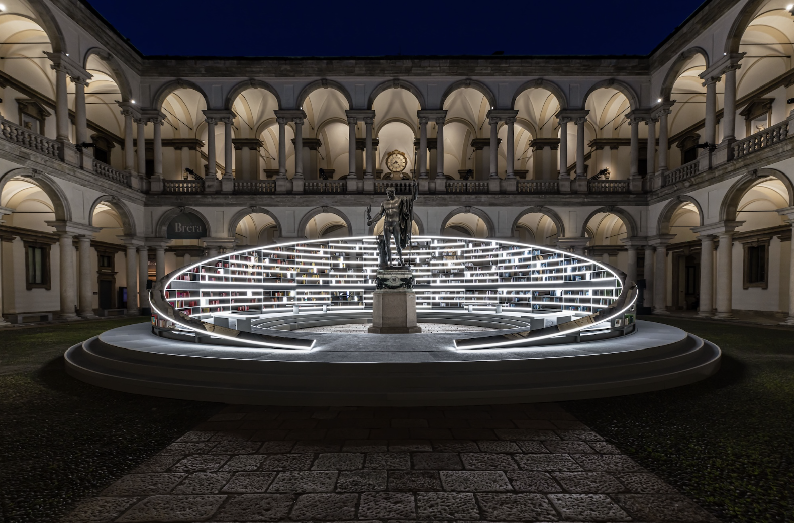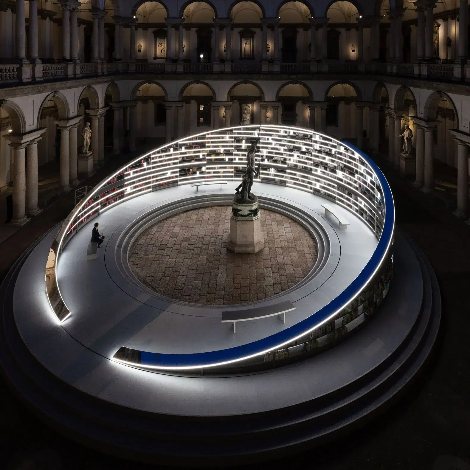 At the Pinacoteca di Brera, Es Devlin brings us Library of Light, a revolving installation of books and mirrors that turns reading into ritual. More than 3,000 titles—selected in response to this year’s Thought for Humans theme—glide through sunlight and shadow, revealing new perspectives with every slow rotation. As always with Devlin, light becomes metaphor and motion becomes meaning.
