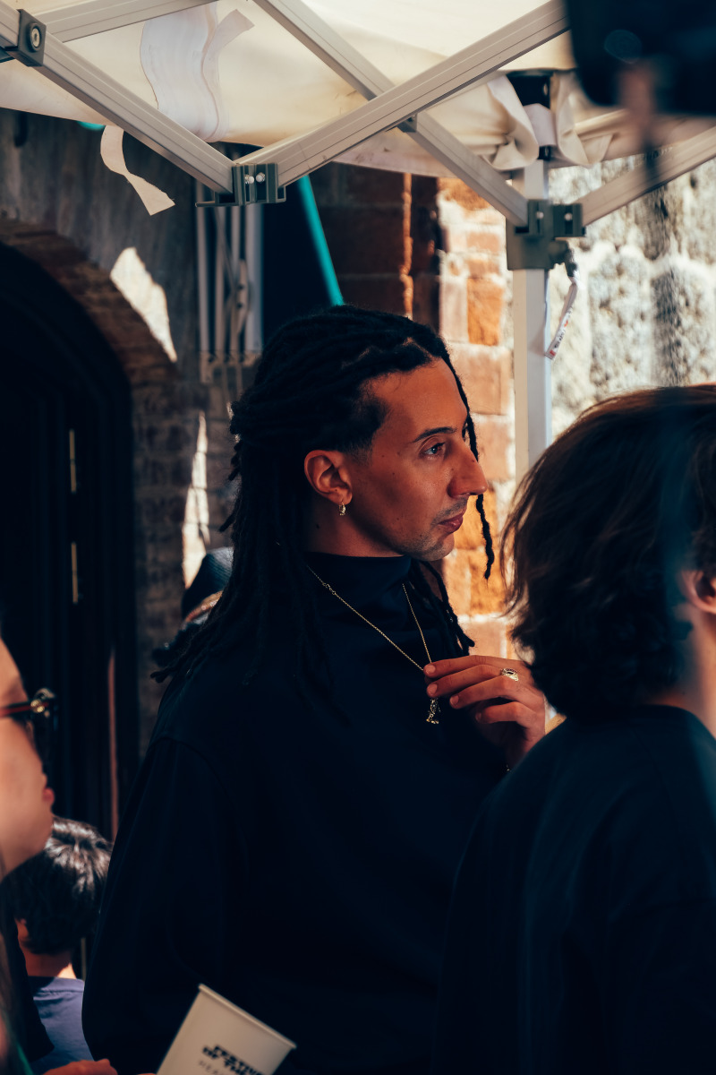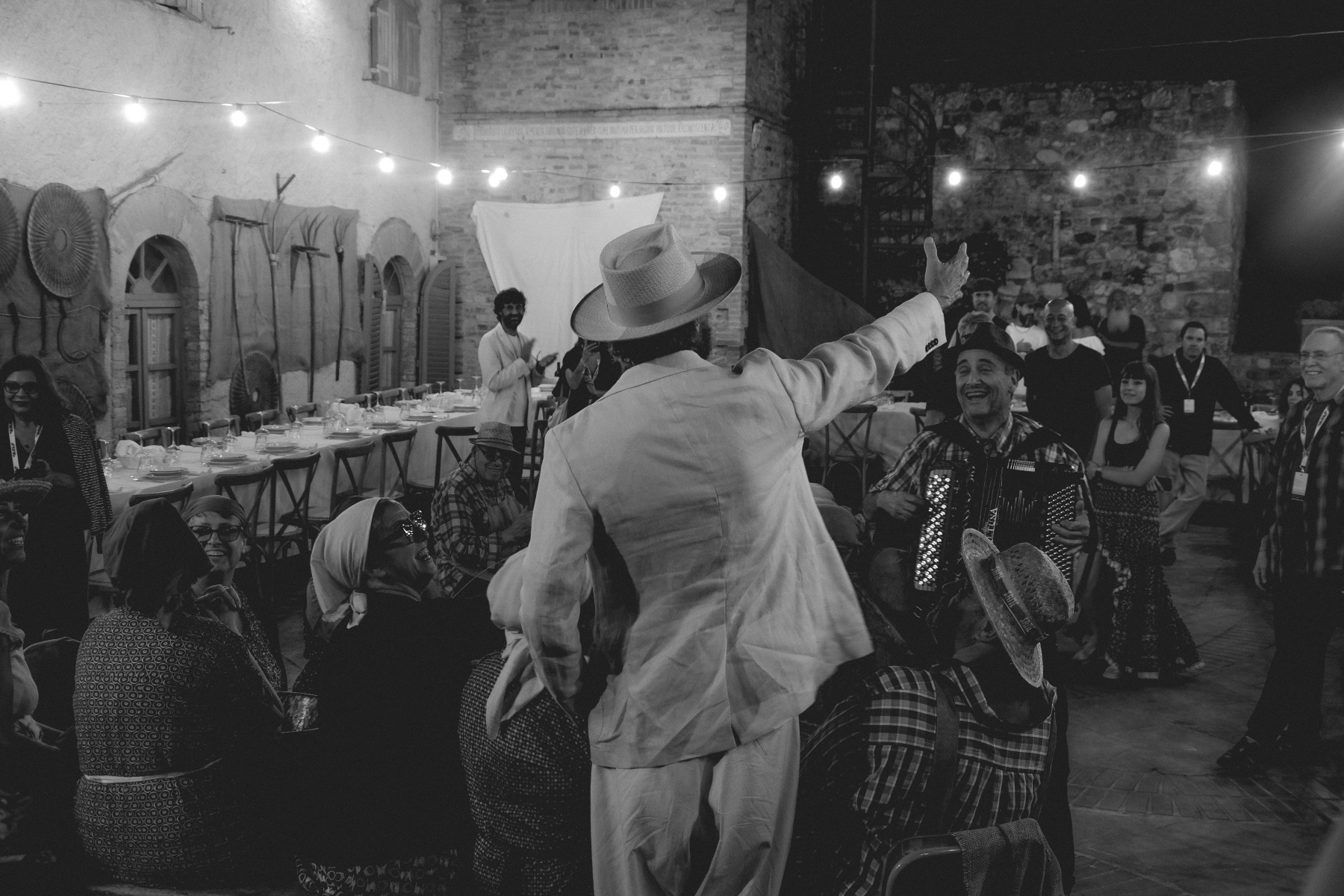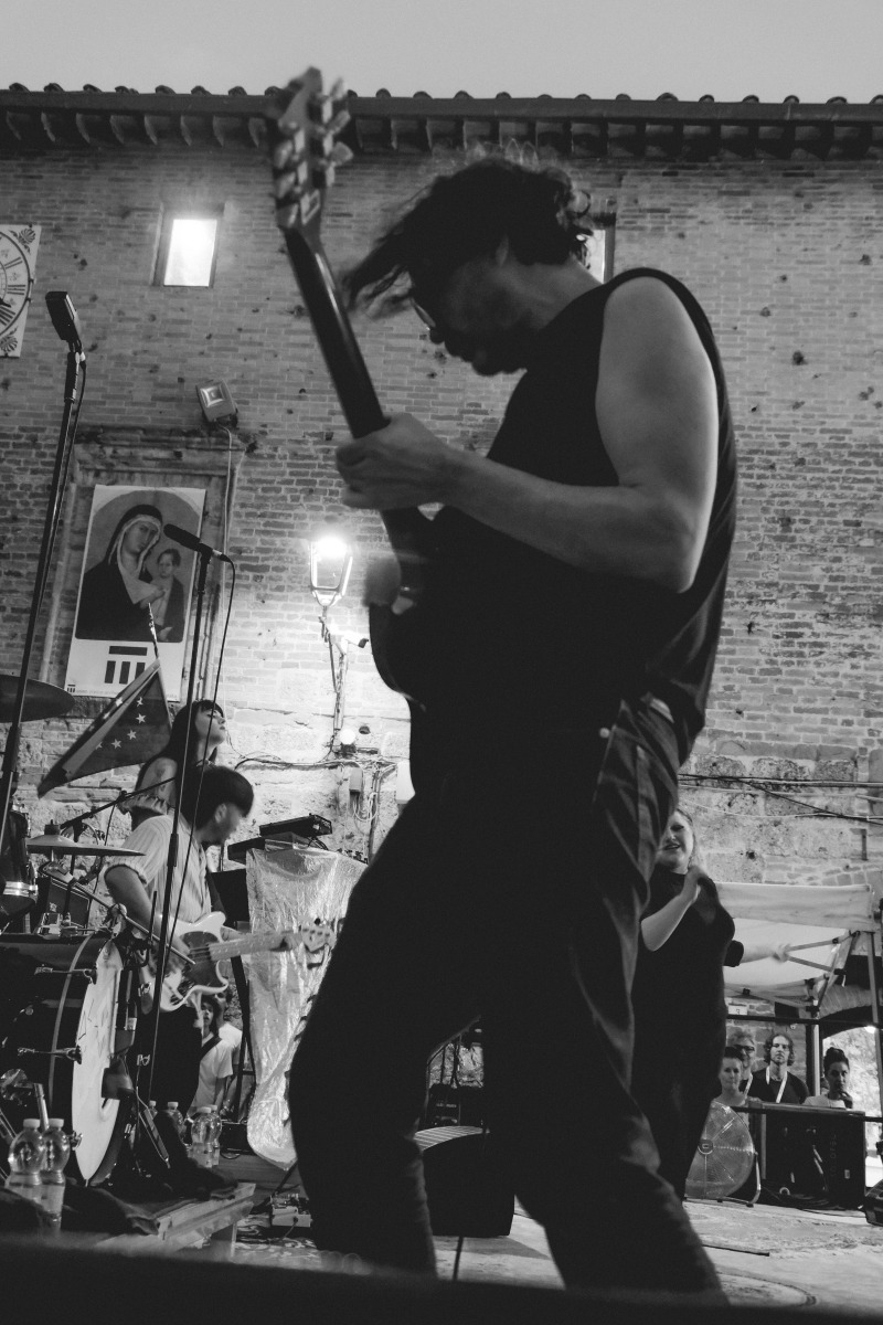 Rubin is one of the most enigmatic figures in pop culture; a spiritual sono-guru from the New York suburbs who was influential in the development of so many musical genres and artists. He spends some of his time here in Italy, away from Shangri-La, the studio where he works as a producer and self-styled researcher (really—Rubin is responsible for maintaining the archives of the most fascinating and rare books, music and paraphernalia). “I wish I had come to this part of Italy earlier in my life,” he tells me, “It’s just so beautiful and inspiring.” Today, we’re standing in the church’s courtyard, which is used as the festival’s communal hub. It is an enchanting Tuscan stone-walled scene populated by glamorous people mingling beside slender antique columns. A generous buffet is presented on a single long table, composed of produce from local farmers and other Italian classics. There is a keen anticipation to know who will perform in the church and on the stage in front of the Casolei. Italian actors like Riccardo Scamarcio are there, as is rapper Ghali (whose unannounced presence elicits furor from the local teenagers) and filmmaker Damien Chazelle. The Festival of the Sun is La dolce vita as told by Rick Rubin—a celebration of the good life spent with cool people. But there’s a reason you might not have heard of it yet.
