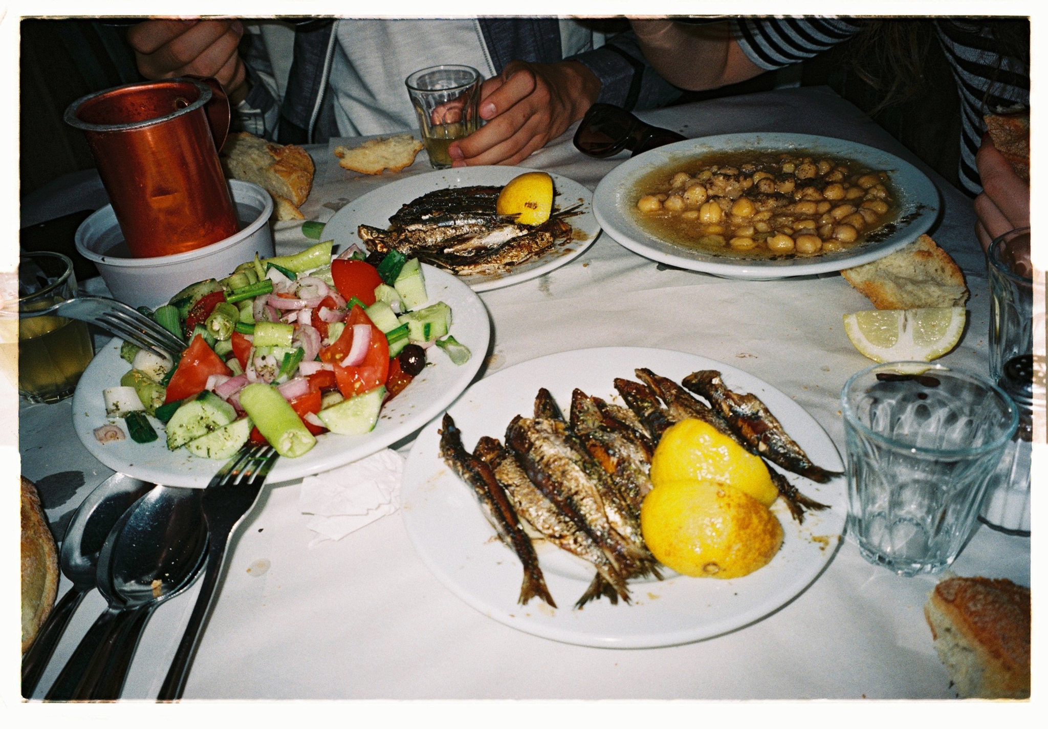 I had been to Athens before, but I always sought an older idea of the city that grew out of my being a part of the diaspora: the creaking tavernas, rebetika clubs, and the lingering ghosts of Giorgios Seferis, Patrick Leigh Fermor, and Henry Miller, who wrote about Greece as a place of myth, not modernisation. This time I wanted to understand the image of New Athens through people like Christine’s eyes, as well as those of a few other well-placed friends. But the first time we met up, it was at a traditional, and recently-opened, taverna in Kolonaki called Mpirmpilo. She happened to stand next to me as I was walking from Pangrati, and I remember finding her beautiful immediately; more than I had in London when we first met. “Chris [Kontos] used to eat here all the time,” she remarked when we stepped into the restaurant—a sentence she knew would make an impression on me. We feasted on horiatiko salads, fried courgettes, saganaki fried cheese, loukaniko sausages, and flaky cheese pies, and as we spoke at length—to thank her for agreeing to show me around—I gave Christine a large bar of milk chocolate from Harrods, wrapped in gold foil and an ivy green sleeve.