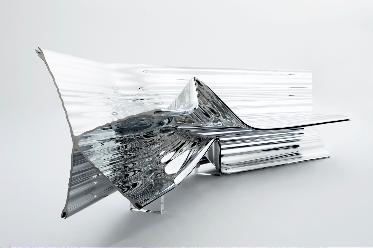 Thomas Heatherwick, CBE, RA, RDI and HonFREng, is the most famous designer in the world. After doing a diploma in art and design in London, an undergraduate degree in 3D design at Manchester Polytechnic and a masters in furniture design at the RCA, his first commission came from Sir Terence Conran and at the precocious age of 24 founded Heatherwick Studio. Now, at the age of 55, he leads a team of 250 creative minds from his studio, Making House in King’s Cross. Famous for undulating buildings and nature-integrated wonders such as Azabudai Hills and 1000 Trees in Shanghai, Heatherwick has also designed an unfurling bridge, fantastical furniture, sculpture, Christmas cards, a pollution-eating car, a boat, a Longchamp ‘Zip’ bag, NYC’s ‘Little Island’ floating park, a bus and the blazing copper lily cauldron for the opening ceremony of the 2012 Olympic Games. I was greeted at Making House by the back of a red Routemaster, The Friction Table, metal extrusion bench, shiny spinning top chair and a forest of lit-up maquettes. Thomas magicked the carmine Friction Table in front of us from round to long oval.