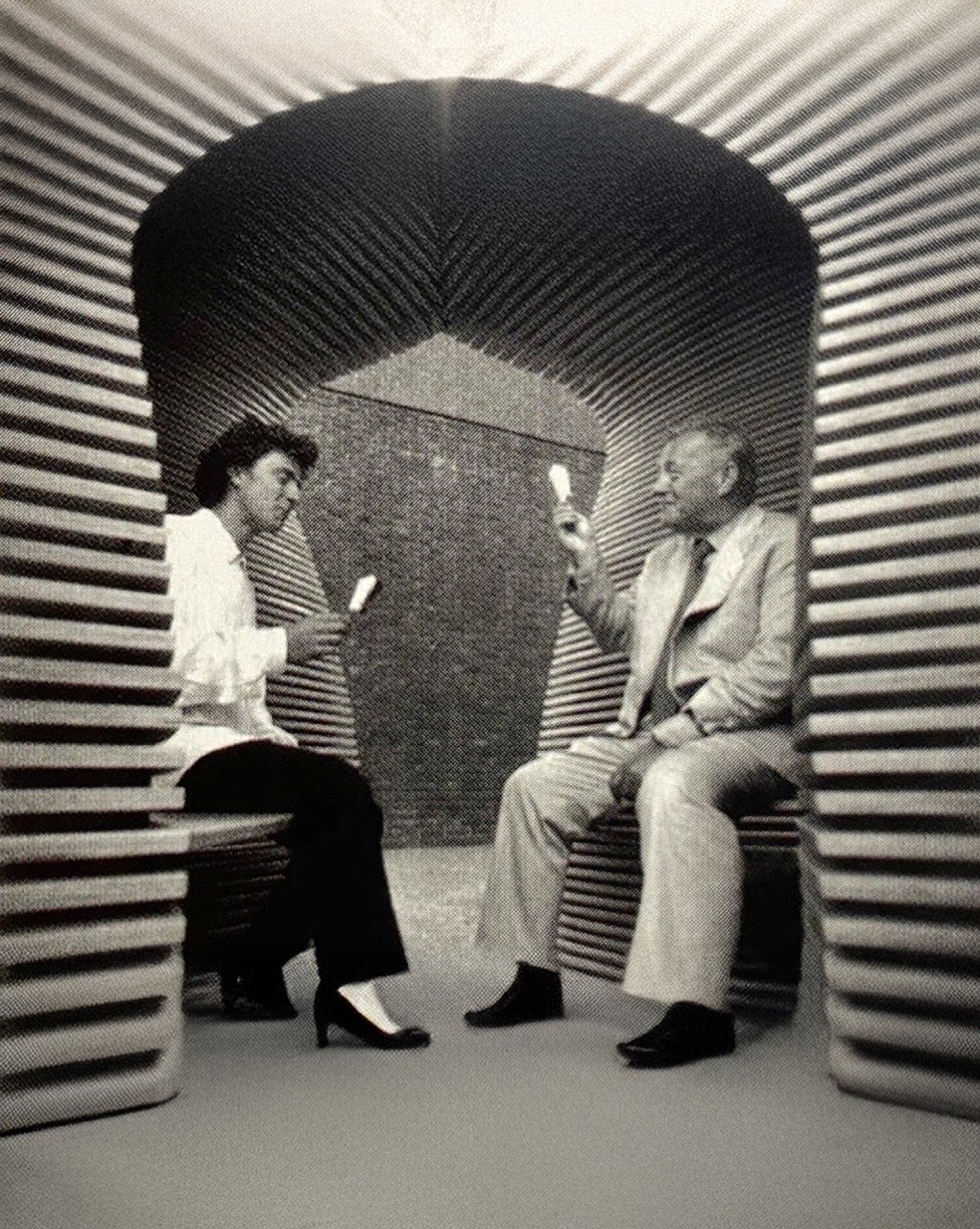 Thomas Heatherwick and Sir Terence Conran in the gazebo Conran commissioned (1994). Courtesy of Heatherwick Studio.
