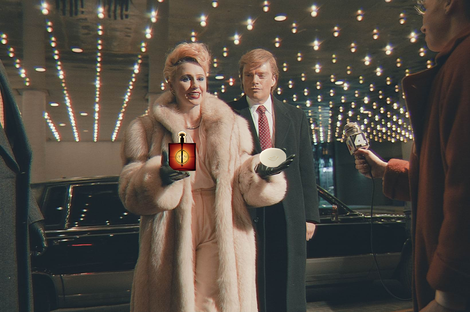 Looking up the notes of President (ugh) Trump’s own perfume Victory Cologne President Trump I’m initially surprised to find that the fragrance—in a gold bottle with a matching cap shaped like his head—doesn’t smell heavily of oud and leather, and instead is a fresh and clean fragrance with notes of basil, mint and cucumber. But at the same time, what did I expect? In Ali Abbasi’s The Apprentice, we watch a young Trump, played by Sebastian Stan, as he compulsively and aggressively washes his hands in the bathroom with such intensity that the bar soap eventually shoots out of his hands. As a man who is afraid of germs, abstains from alcohol, and likely has the tastebuds of a child, he likely smells of Dove bar soap combined with a slight, pungent smell from his anaemic diet, and the residue of the cucumber cologne he sprayed on in the morning. Meanwhile his wife Melania, a Slovenian 1980s babe, wants to wear something classy and rich-smelling like Yves Saint Laurent’s Opium, but has to settle three steps down with something her husband will tolerate, such as the grandma-like soapy floral of Anaïs Anaïs from Cacharel.
