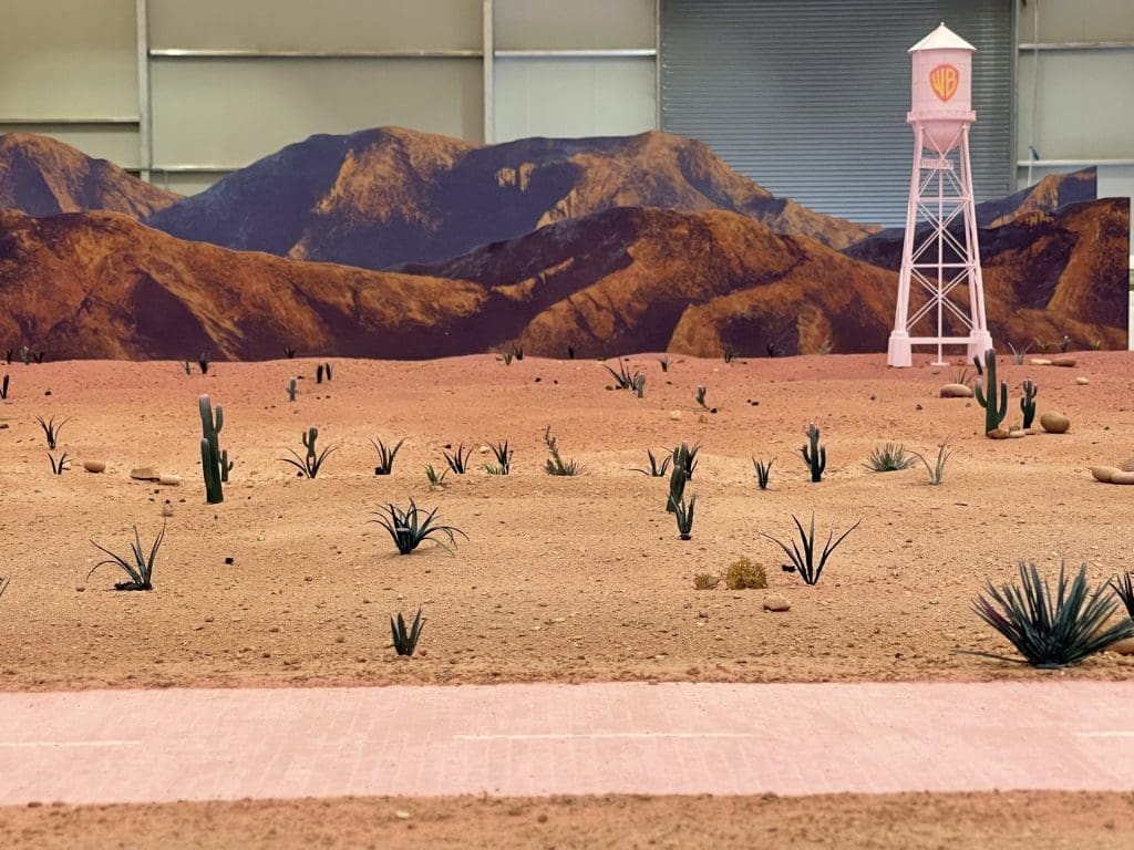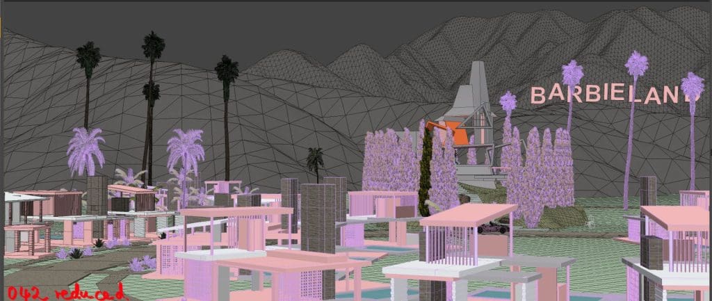 Whilst being hermetically sealed, Barbie’s universe was also intended to feel expansive. The miniature department was called in to create buildings and objects in the ‘world beyond.’ Shops, cinemas and pet shops were made as miniatures before being scaled up in post-production. “It feels really real and tangible,” says Spencer. “But then it still keeps its toy-feel.” The mountain backdrop meanwhile, was designed after that of San Jacinto, Palm Springs. “What I love about LA, and Palm Springs in particular, is that you have this incredibly harsh and pure sunlight. And as it moves around the mountains you have these incredible shadows,” says Greenwood. “Flat grass with palms and sunshine – it’s very graphic. Our DOP Rodrigo Prieto did something very interesting – he’d have seven massive ‘suns’ rigged so you’d be lit from every angle. Because it’s always a perfect day in Barbieland.”