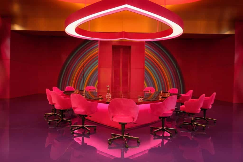 For Barbie, the first aesthetic conundrum was to select a shade of pink. “There were pinks we couldn’t use,” says Greenwood. “Greta called one of them a pornographic pink—a very 1980s perfume pink.” Gerwig also didn’t want to go down the millennial pink route. (“We immediately googled ‘What’s millennial pink?’” says Greenwood). “It took a lot of arriving at,” says Spencer. “We mixed the pink [. . .] it’s based on a Rosco pigment and when you look at it in the pot it’s like a treacle, really dark. You mix it with white and you can create various shades. What’s lovely about it is there’s no blue in it. There’s a real purity to the look – it was like nothing anybody had ever seen before.”