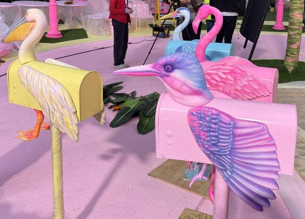 Whilst Spencer and Greenwood explain that they did not themselves play with Barbie (in the UK, Cindy was the doll of choice when they were children), they immersed themselves in it. “Barbie is so monumental in the States. It’s like Coca-Cola. It’s part of their DNA,” says Greenwood. To build the house they examined Barbie’s abodes, from the cardboard houses of the 1960s to her Huf Haus-style dreamhouse. But their final design was more inspired by the houses of Palm Springs, with mid century modern-inspired furntiure and individual swimming pools (fake, of course) and their own exotic bird-adorned mailbox. “We have a fascination with all things American.” says Spencer.