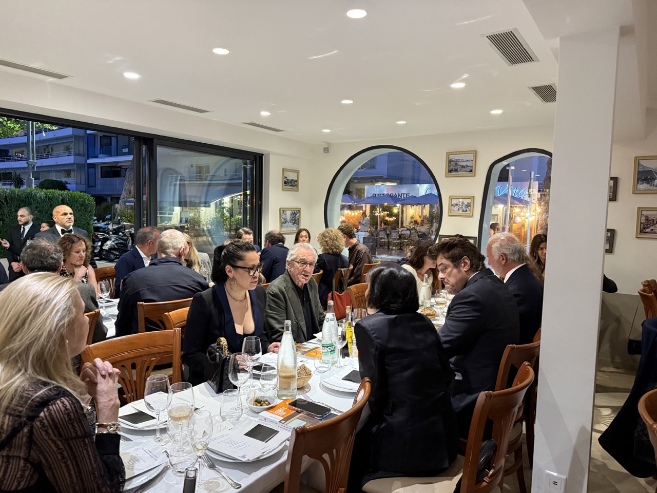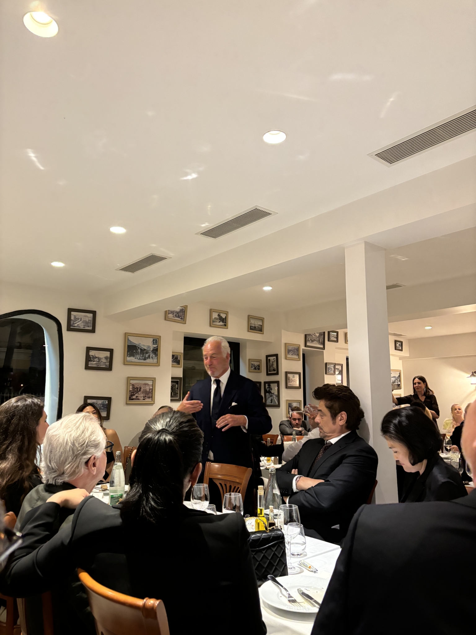 The dinner kicked off at 8pm, with drinks by the boules pitches and live music from the legendary Gypsy Kings. Star of The Phoenician Scheme Benicio Del Toro was our guest of honour (and our Issue 11 cover star). With Robert De Niro there, he turned his acceptance speech (Charles gets a silver rabbit’s pin made for each honoree), Del Toro turned towards his hero, “I went in to do my first reading with De Niro,” he said. “I had two lines, and he had four lines. And he took out his line, and then he scratched my line, and then he scratched his line, and then he scratched my line. I said, ‘well, now I don’t have any lines.’ He said, ‘it’s gonna be better.’ I took that to heart and made a career out of saying nothing.”