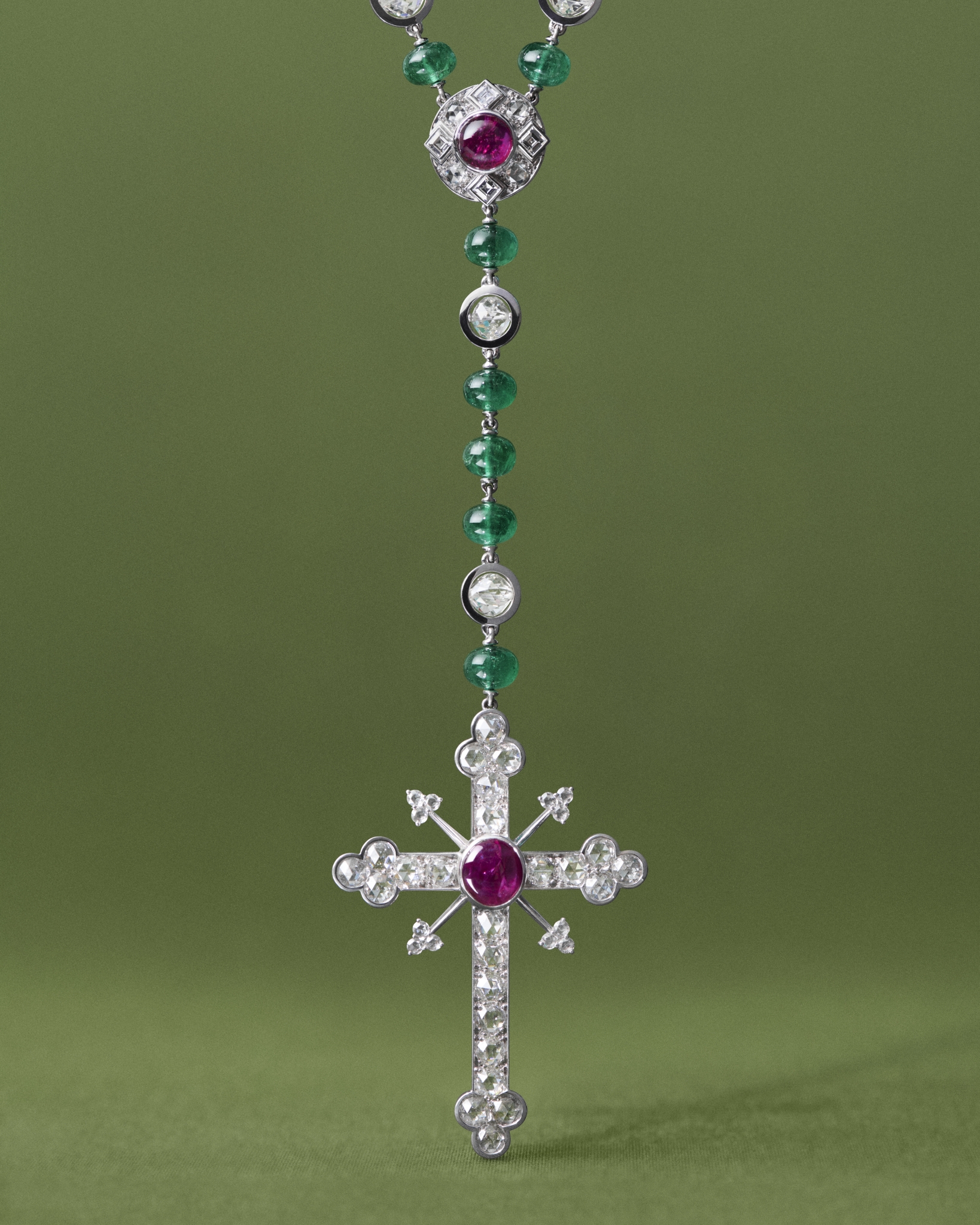The film’s style is a throwback to the gripping and glamorous cross-country adventures of the early twentieth-century. There are examples of luxury items in Korda’s home – all used to convey a sense of his character. But one stands out above all else. Anderson requested a bespoke rosary inspired by the house’s cross pendant made in 1880 (the original is a part of the Cartier Collection). It is worn by Threapleton throughout the film, replacing her basic wooden one, and is shown frequently as she changes from pious and humble to her father’s daughter, with a penchant for the finer things. The piece itself is a genuine piece of craftsmanship, combining emeralds and rubies in stylised circular motifs with square-shaped diamonds. If we were going to conceptualise a creation worthy of that era’s magic – so beautiful it only adds to the actor’s charm – this would be it. We imagine it becoming another iconic piece in the future.
